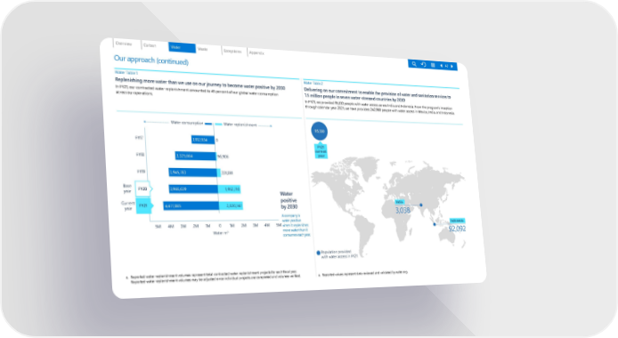 3,038 India Population provided with water access in FY21 92,092 Indonesia FY21 current year 95,130 Water positive by 2030 A company is water positive when it replenishes more water than it consumes each year. 0 2M 5M 5M Water m 3 FY17 FY18 FY19 FY20 FY21 Base year Current year 1M 4M 3M 1M 2M 3M 4M Water consumption Water replenishment 1,912,934 3,325,664 3,945,783 3,966,639 4 , 47 7, 8 65 96,906 331,081 1,952,710 2,020,747 0 Water Table 1 Replenishing more water than we use on our journey to become water positive by 2030 In FY21, our contra cted water replenishment amounted to 45 percent of our global water consumption across our operations. a. Reported water replenishment volumes represent total contracted water replenishment projects for each fiscal year. Reported water replenishment volumes may be adjusted once individual projects are completed and volumes verified. Water Table 2 Delivering on our commitment to enable the provision of water and sanitation services to 1.5 million people in seven water-stressed countries by 2030 Our approach (continued) In FY21, we provided 95,130 people with water access across India and Indonesia. From the program’s inception through calendar year 2021, we have provided 242,988 people with water access in Mexico, India, and Indonesia. a. Reported values represent data reviewed and validated by water.org . 47