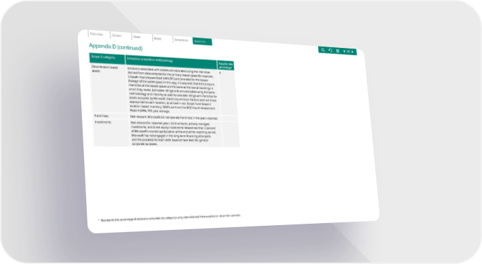 Scope 3 category Emissions calculation methodology Supplier dat a percen tage * Downstream leased assets Emissions associated with sublets are calculated using the intensities deri ved from data collected for the primary leased space (for example, kilowatt-hours/square foot [kWh/SF]) and prorated for the square foo tage of the sublet space. In this way, it is assumed that the emissions intensities of the leased spaces are the same as the overall buildings in which they reside. Estimated refrigerants are calculated using the same methodology and intensity as used to calculate refrigerant intensities for assets occupied by Microsoft. Electricity emission factors used are those appropriate to each location, as utilized in our Scope 1 and Scope 2 location-based inventory. GWPs are from the IPCC Fourth Assessment Report (AR4), 100-year average. 0 Fran chises Not relevant. Microsoft did not operate franchises in the years reported. Investments Not relevant for reported years. Joint ventures, actively managed inve stments, and direct equity investments totaled less than 2 percent of Microsoft’s market capitalization at the end of the reporting period. Microsoft has not engaged in the long-term financing of projects and the proceeds for each debt issuance have been for general corporate purposes. Appendix D (continued) * Represents the percentage of emissions calculated (by category) using data obtained from suppliers or value chain partners. 109 109