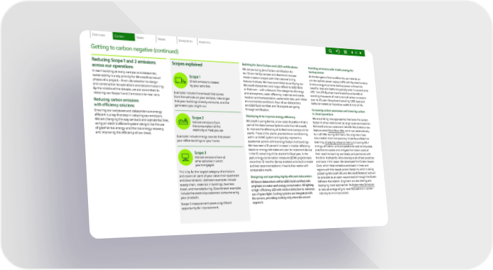 Getting to carbon negative (continued) Reducing Scope 1 and 2 emissions across our operations In each building at every campus and datacenter, sustainability is a key priority for Microsoft across all phases of a project—from site selection to design and construction to operations and decommissioning. By the middle of the decade, we are committed to reducing our Scope 1 and 2 emissions to near zero. Reducing carbon emissions with efficiency solutions Ensuring our campuses and datacenters are energy efficient is a key first s tep in reducing our emissions. We are changing the w ay we build and operate facilities, using all-elect ric efficient system designs like the use of geothermal ene rgy and thermal energy recovery, and improving th e efficiency of our cloud. Scopes explained Scope 1 Direct emissions created by your activities Examples include the exhaust that comes from the vehicles on your campus, natural gas that your buildings directly consume, and the generators you might run. Scope 2 Indirect emissions from the consumption of the electricity or heat you use Examples include energy sources that power your office buildings or your home. Scope 3 Indirect emissions from all other activities in which you ́re engaged This is by far the largest category of emissions and covers all parts of your value chain (upstream and downstream). Upstream examples include supply chain, materials in buildings, business travel, and manufacturing. Downstream examples include the electricity customers consume using your products. Scope 3 measurement poses a significant opportunity for improvement. Building for Zero C arbon and LEED certifications We are pursuing Z ero Carbon certification for our Silicon Val ley campus and Redmond campus modernization project with International Living Futures Institute. We have committed to certifying our Microsoft dat acenters and major offices to LEED Gold or Platinum—wi th a focus on the categories of energy and atmospher e, water efficiency, materials and waste, location and t ransportation, sustainable sites, and indoor environmental conditions. Four of our datacenters are LEED Gold cer tified and 74 projects are going through certification. Deploying AI to im prove energy efficiency Microsoft is usi ng Bonsai, a low-code AI platform that is part of the Autonomous Systems suite from Microsoft, to improve the ef ficiency of its Redmond campus chiller plants. These ch iller plants provide the air conditioning within an HVAC system and typically represent a substantial portion of the energy footprint of buildings. We have seen a 12 per cent increase in median efficiency based on energy e stimates and plan to implement Bonsai in the 12 remain ing chiller plants this fiscal year. In the past, energy co nservation measures (ECM) projects took more than 12 months. Bonsai enabled us to build a model and test recommendations in two to four weeks with comparable results. Designing and op erating highly efficient datacenters All future datacenters will be LEED Gold certified with emphasis on water and energy conservation. All lighting is high-efficiency LED with motion detection to minimize use of space light. Cooling systems are integrated with the servers, providing cooling only when the servers require it. 21 Avoiding emissions with kinetic energy for backup power At the Bengaluru C osmo office site, we installed an uninterruptible power supply (UPS) with flywheel to store kinetic energ y to provide backup power without the need for lead acid batteries typically used in conventional UPS. The UPS flywh eel has the additional benefit of avoiding thous ands of metric tons of carbon emissions over its 20-year lifecycle and avoiding 1,500 lead acid batteries treated as hazardous waste at end-of-life. Increasing ca rbon awareness and lowering carbon in cloud operations We are piloting n ew approaches that lower the carbon footprint of our code as well as large-scale workloads for Microsoft and o ur customers’ benefit. We piloted a new feature calle d Start/Stop VM s , which can automa tically turn off VMs during idle hours. Our engineers have also created more transparency inside Azure Machine Learning, displaying reso urce metrics (including GPU e nergy, utilization, and computational cost) to help data practitioners assess and mitigate the hidden costs of their machine learning workloads, and partnered with the Allen Institute for AI to develop a set of best practices and tools in this space. We developed the Carbon Aware Core, which helps schedule workloads in times and regions with the lowest carbon footprint, which is being piloted by Microsoft 365 and Microsoft Research and will be provided as an open-source toolkit through the Green Software Foundation. Engineers are also testing and deploying novel approaches like Kubernetes Sche duler to take advanta ge of grid-level fluctuations in carbon intensity to mi nimize carbon.