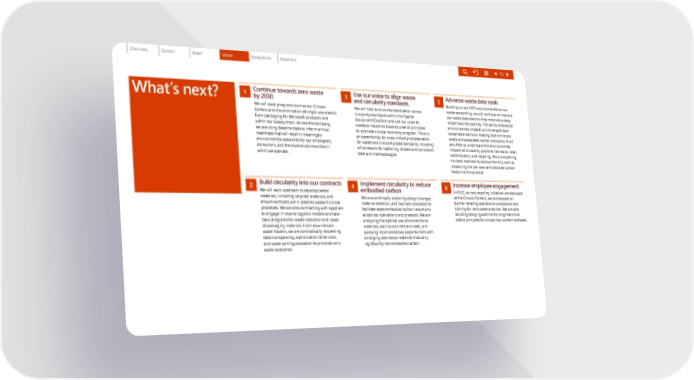 What’s next? 1 Continue towards zero waste by 2030 We will scale programs such as our Circular Centers and the elimination of single-use plastics from packaging for Microsoft products and within our supply chain. Across the company, we are using baseline data to inform annual roadmaps that will result in meaningful environmental outcomes for our employees, consumers, and the diverse communities in which we operate. 2 Build circularity into our contracts We will work upstream to develop better materials, including recycled materials, and ensure contracts are in place to support circular processes. We are also contracting with suppliers to engage in reverse logistics models and take- back programs for waste reduction and reuse of packaging materials. From downstream waste haulers, we are contractually requesting data transparency, optimization of services, and waste sorting education to promote zero waste outcomes. 3 Use our voice to align waste and circularity standards We will help to drive standardization across circularity standards within the Capital Equipment Coalition and use our voice to coalesce industries towards a set of principles to promote circular economy progress. There is an opportunity for cross-industry collaboration for waste and circularity data standards, including a framework for capturing reliable and consistent data and methodologies. 4 Implement circularity to reduce embodied carbon We are continually exploring design changes, material selection, and business processes to facilitate deep embodied carbon reductions across our operations and products. We are analyzing the optimal use of conventional materials, such as concrete and steel, and pursuing more ambitious opportunities with emerging alternative materials that carry significantly less embodied carbon. 5 Advance waste data tools Building on our FY21 work to transform our waste accounting, we will continue to improve our waste data tools so they more accurately model business activity. The ability to forecast environmental impacts will drive upstream sustainable decision-making that minimizes waste and associated carbon emissions. It will also help us understand the environmental impacts of circularity practices like reuse, repair, redistribution, and recycling. We are exploring the best methods to account for this, such as measuring the per-year and absolute carbon footprint of a product. 6 Increase employee engagement In FY22, as new recycling initiatives are deployed at the Circular Centers, we are focused on further iterating operational procedures and training for zero waste practices. We are also building design guidelines for engineers that define principles for circular, low-carbon hardware. 75