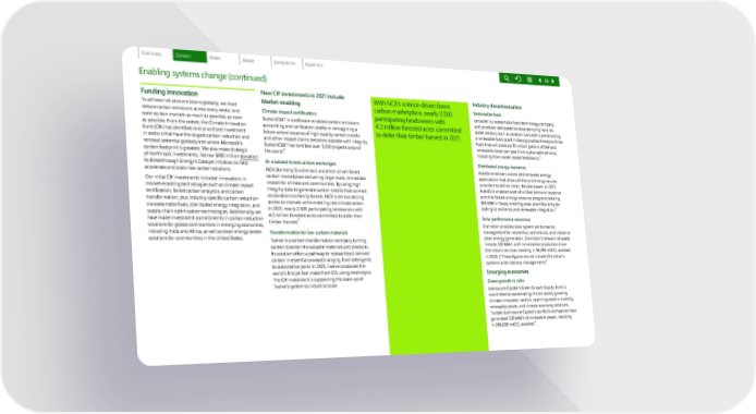 Funding innovation To achieve net zero emissions globally, we must reduce carbon emissions across every sector and scale carbon markets as much as possible, as soon as possible. From the outset, the Climate Innovation Fund (CIF) has identified and prioritized investment in sectors that have the largest carbon reduction and removal potential globally and where Microsoft’s carbon footprint is greatest. We also make strategic philanthropic investments, like our $100 million donation to Breakthrough Energy’s Catalyst initiative, to help accelerate and scale new carbon solutions. Our initial CIF inve stments included innovations in market-enabling technologies such as climate impact certification, forest carbon analytics, and carbon transformation, plus industry-specific carbon reduction via sustainable fuels, distributed energy integration, and supply chain optimization technologies. Additionally, we have made investment commitments in carbon reduction solutions for global communities in emerging economies, including India and Africa, as well as clean energy access solutions for communities in the United States. Enabling systems change (continued) New CIF investments in 2021 include: Market-enabling Climate impact certification SustainCERT is a software-enabled carbon emissions accounting and ve rification platform reimagining a future where issuance of high-quality carbon credits and other impact claims becomes scalable with integrity. SustainCERT has certified over 1,200 projects around the world. 8 AI-enabled forest carbon exchanges NCX (formerly SilviaTerra) is a science-driven forest carbon marketpla ce delivering large-scale, immediate impact for climate and communities. By using high integrity data to generate carbon credits that connect corporations to family forests, NCX is democratizing access to markets while enabling real climate action. In 2021, nearly 2,500 participating landowners with 4.3 million forested acres committed to defer their timber harvest. 8 Transformation to low-carbon materials Twelve is a carbon transformation company turning carbon dioxide in to valuable materials and products. Its solution offers a pathway to replace fossil-derived carbon in essential products ranging from detergents to automotive parts. In 2021, Twelve produced the world’s first jet fuel made from CO 2 using electrolysis. The CIF investment is supporting the scale-up of Twelve’s system to industrial scale. With NCX’s science-driven forest carbon marketplace, nearly 2,500 participating landowners with 4.3 million forested acres committed to defer their timber harvest in 2021. Industry decarbonization Sustainable fuels LanzaJet is a sustainable fuels technology company and producer dedic ated to decarbonizing hard-to- abate sectors, such as aviation. LanzaJet is constructing a renewable fuels plant in Georgia called Freedom Pines Fuels that will produce 10 million gallons of SAF and renewable diesel per year from sustainable ethanol, including from waste-based feedstocks. 8 Distributed energy resources AutoGrid delivers a suite of distributed energy applications th at allow utilities and energy service providers to deliver clean, flexible power. In 2021, AutoGrid enabled a set of unified demand response and distributed energy resource programs totaling 165 MW in Texas, enabling peak plant flexibility for both grid resilience and renewable integration. 8 Solar performance assurance Omnidian provides solar system performance management for r esidential, commercial, and industrial clean energy generation. Omnidian’s network of assets include 326 MW * , with incremental production from Omnidian’s services resulting in 14,090 mtCO 2 avoided in 2020. ( * These figures do not include Omnidian’s systems under backup management. ) 8 Emerging economies Green growth in India Eversource Capital’s Green Growth Equity Fund is committed to a ccelerating India’s rapidly growing climate innovation sectors, spanning electric mobility, renewable power, and circular economy solutions. To date, Eversource Capital’s portfolio companies have generated 330 MWh of renewable power, resulting in 290,000 mtCO 2 avoided. 8 36