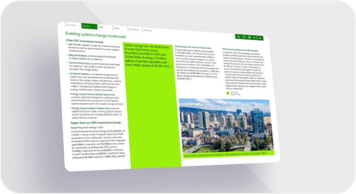 Enabling systems change (continued) Other 2021 investments include: • Just Climate , a global, climate-l ed investment business focused on scaling capital towards the most impactful climate solutions. • Buoyant Ventures , a ven ture capital fund focused on digital solutions for climate risk. • Carbon Direct Fund , a gr owth equity fund dedicated to investing in high-growth carbon removal and utilization technology leaders. • Earthshot Ventures , a cl imate technology venture capital fund, spun out of Elemental Excelerator that builds on their global network of customers, investors, corporations, and policymakers. Earthshot Ventures invests in hardware and software technologies in energy, mobility, food, industry, and carbon. • Energy Impact Partn ers Elevate Future Fund, a venture capital fund focused on creating a more diverse founder community and inclusive venture capital ecosystem within the broader energy transition. • Energy Impact Part ners Frontier Fund , a venture capital fund which invests in emerging technologies providing solutions for the deep decarbonization of asset-intensive industries. Impact from our 2020 investments include: Supporting clean energy in Asia Via the Southeast Asi a Clean Energy Facility (SEACEF), we invested in Xurya, a clean energy company committed to accelerating the rooftop solar market in Indonesia. It executed the first wa ve of projects with 16.5 megawatts peak (MWp) in operat ion and 16.6 MWp under contract for construction as of November 2021, up from 0.8 MWp installed at th e time of SEACEF’s investment. In the 12 months following SEACEF’s investment, Xurya produced 6,765 MWh resulting in 5,800 mtCO 2 avoided. 8 Carbon savings from the deployment of smart thermostats across SmartRent’s portfolio in 2020 were 55,000 MWh of energy, 5.5 million gallons of gasoline equivalent, and a net carbon savings of 68,000 mtCO 2 . 8 Saving energy with smart home automation Energy Impact Partners (EIP) Fund II participated in SmartRent ’s $60 million Series C funding round. SmartRent is a smart home automation platform which provides property managers with visibility and control over assets and delivers a smart home experience to residents in the United States and Canada. Environmental savings from the deployment of smart thermostats across its portfolio in 2020 were estimated to be 55,000 MWh of energy, 5.5 million gallons of gasoline equivalent, and carbon savings of 68,000 mtCO 2 . 8 Addressing air pollution and climate inequities In September 2021, The Proceedi ngs of the National Academy of Sciences published a study that found that Hispanic and Black people in the San Francisco Bay Area experienced up to 30 percent higher air pollution than average. Drawing from Aclima’s mobile measurements, the authors including UT Austin, UC Berkeley, and Aclima scientists found that substantial disparities arise from regional and local differences in pollution. These findings show that combining hyperlocal air pollution data with demographic data is an important way to identify disproportionate impacts that go unseen using traditional methods and can help decision-makers target emission reduction and mitigation efforts where they are needed most. 8 Learn more about CIF here 37 Aclima’s mobile measurements can help decision-makers target emission reduction and mitigation efforts.
