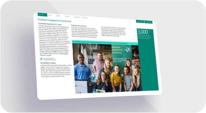 Employee engagement (continued) 10 Sustainable disposition of IT assets The Sustainability Community not only helps Microsoft lower its own operational carbon and waste footprint, but also creates a way to share these best practices with external organizations so they can do the same. A Microsoft employee noticed a gap in our internal processes: as customers migrate from on-premises IT assets to the cloud (Azure), the on-premises hardware, like servers and racks, becomes e-waste, which can create serious environmental hazards if it’s not properly disposed of. The issue was raised to the Azure leadership through the community, and a new resource was developed to guide customers on how to ensure the sustainable, secure, and compliant disposition of IT assets. This guide is being used by our Azure Migrate & Modernize Program (AMMP) customers, through which 20,000 virtual machines and 2,000 databases have been migrated. Learn more about the IT Asset Disposition Guide Sustainability training In October 2021, we launched the Sustainability in Action badge. This is the fir st all-employee learning course focused on sust ainability, with four hours of content on carbon, water , waste, and ecosystems. Within the first two months, mor e than 3,000 employees completed the course, and can serve as sustainability champions in their daily work as well as personal lives. Employee-led education In April 2021, to celebrate the 51 st anniversary of Earth Day, the Microsoft Sustainability Community organized three days of learning sessions to educate, inspire, and activate employees on the importance of sustainability. Volunteers coordinated more than 40 sessions and generated 30 hours of evergreen learnin g content covering topics from green software engineering to how to live a zero waste lifestyle at home. More than 3,600 people from 56 countries participated. LinkedIn celebrated Earth Day with over 61 global experiences and participation from nearly 2,900 employees at the virtual events. Our employee co mmunities drive bottom-up sustainability initiatives to educate, inspire, and activate employees. 3,000 3,000 employees completed Sustainability in Action training within the first two months.
