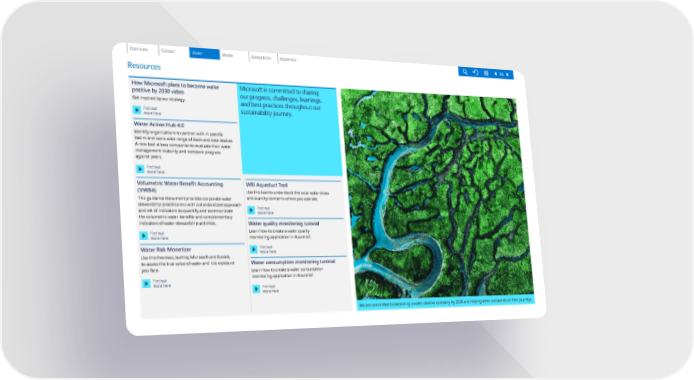 Resources How Microsoft plans to become water positive by 2030 video Get inspired by our strategy. Find out more here Water Action Hub 4.0 Identify organizations to partner with in specific basins and use a wide range of tools and case studies. A new tool allows companies to evaluate their water management maturity and compare progress against peers. Find out more here Volumetric Water Benefit Accounting (VWBA) This guidance document provides corporate water stewardship practitioners with a standardized approach and set of indicators to quantify and communicate the volumetric water benefits and complementary indicators of water stewardship activities. Find out more here Water Risk Monetizer Use this free tool, built by Microsoft and Ecolab, to assess the true value of water and risk exposure you face. Find out more here Microsoft is committed to sharing our progress, challenges, learnings, and best practices throughout our sustainability journey. WRI Aqueduct Tool Use this tool to understand the local water stress and scarcity concerns where you operate. Find out more here Water quality monitoring tutorial Learn how to create a water quality monitoring application in Azure IoT. Find out more here Water consumption monitoring tutorial Learn how to create a water consumption monitoring application in Azure IoT. Find out more here We are committed to becoming a water positive company by 2030 and helping other companies on their journeys. 60