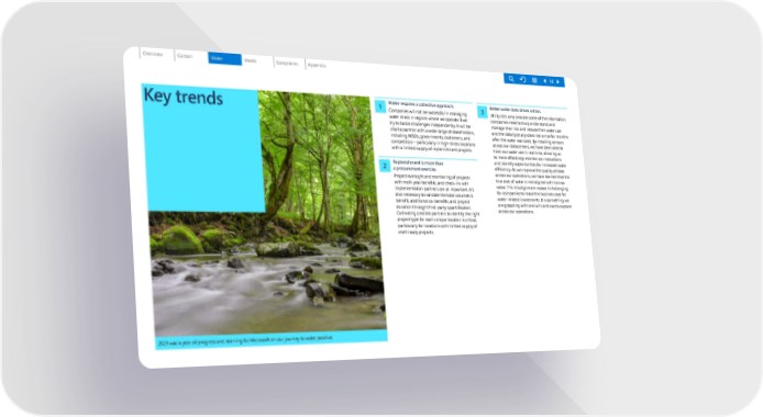 Key trends 2021 was a year of progress and learning for Microsoft on our journey to water positive. 1 Water requires a collective approach. Companies will not be successful in managing water stress in regions where we operate if we try to tackle challenges independently. It will be vital to partner with a wide range of stakeholders, including NGOs, governments, customers, and competitors—particularly in high-stress locations with a limited supply of replenishment projects. 2 Replenishment is more than a procurement exercise. Project oversight and monitoring of projects with multi-year benefits, and check-ins with implementation partners are all important. It’s also necessary to validate the total volumetric benefit, additional co-benefits, and project duration through third-party quantification. Cultivating credible partners to identify the right project type for each unique location is critical, particularly for locations with limited supply of shelf-ready projects. 3 Better water data drives action. Utility bills only provide some of the information companies need to truly understand and manage their risk and reduce their water use and the data typically does not arrive for months after the water was used. By installing sensors across our datacenters, we have been able to track our water use in real time, allowing us to more effectively monitor our reductions and identify opportunities for increased water efficiency. As we improve the quality of data across our operations, we have learned that the true cost of water is not aligned with its true value. This misalignment makes it challenging for companies to make the business case for water-related investments. It is something we are grappling with and will continue to explore across our operations. 58