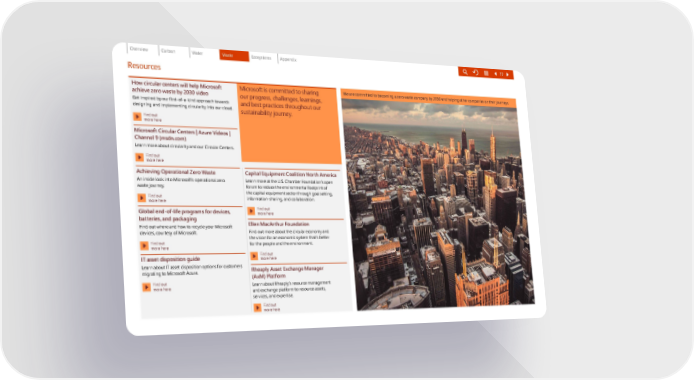 Resources How circular centers will help Microsoft achieve zero waste by 2030 video Get inspired by our first-of-a-kind approach towards designing and implementing circularity into our cloud. Find out more here Microsoft Circular Centers | Azure Videos | Channel 9 ( msdn.com ) Learn more about circularity and our Circular Centers. Find out more here Achieving Operational Zero Waste An inside look into Microsoft’s operational zero waste journey. Find out more here Global end-of-life programs for devices, batteries, and packaging Find out where and how to recycle your Microsoft devices, courtesy of Microsoft. Find out more here IT asset disposition guide Learn about IT asset disposition options for customers migrating to Microsoft Azure. Find out more here Microsoft is committed to sharing our progress, challenges, learnings, and best practices throughout our sustainability journey. Capital Equipment Coalition North America Learn more at the U.S. Chamber Foundation’s open forum to reduce the environmental footprint of the capital equipment sector through goal setting, information-sharing, and collaboration. Find out more here Ellen MacArthur Foundation Find out more about the circular economy and the vision for an economic system that’s better for the people and the environment. Find out more here Rheaply Asset Exchange Manager (AxM) Platform Learn about Rheaply’s resource management and exchange platform to resource assets, services, and expertise. Find out more here We are committed to becoming a zero waste company by 2030 and helping other companies on their journeys. 77