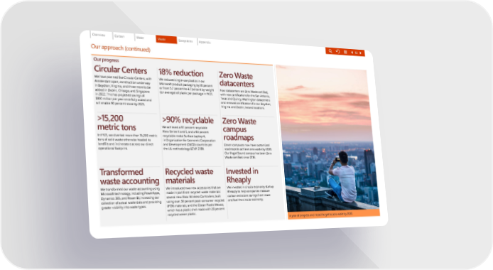Our progress Circular Centers We have planned five Circular Centers, with Amsterdam open, construction underway in Boydton, Virginia, and three more to be added in Dublin, Chicago, and Singapore in 2022. This has projected savings of $100 million per year once fully scaled and will enable 90 percent reuse by 2025. >1 5 , 2 0 0 metric tons In FY21, we diverted more than 15,200 metric tons of solid waste otherwise headed to landfills and incinerators across our direct operational footprint. Transformed waste accounting We transformed our waste accounting using Microsoft technology, including PowerApps, Dynamics 365, and Power BI, increasing our collection of actual waste data and providing greater visibility into waste types. 18% reduction We reduced single-use plastics in our Microsoft product packaging by 18 percent or from 5.7 percent to 4.7 percent by weight (on average) of plastic per package in FY21. >90% recyclable We achieved a 97 percent recyclable Xbox Series X and S, and a 93 percent recyclable metal Surface Laptop 4, in Organization for Economic Cooperation and Development (OECD) countries per the UL methodology ECVP 2789. Recycled waste materials We introduced two new accessories that are made in part from recycled waste materials: several new Xbox Wireless Controllers, built using over 30 percent post-consumer recycled (PCR) materials; and the Ocean Plastic Mouse, which has a plastic shell made with 20 percent recycled ocean plastic. Zero Waste datacenters Four datacenters are Zero Waste certified, with new certifications for the San Antonio, Texas and Quincy, Washington datacenters and renewed certifications for our Boydton, Virginia and Dublin, Ireland locations. Zero Waste campus roadmaps Eleven campuses now have customized roadmaps to achieve zero waste by 2030. Our Puget Sound campus has been Zero Waste certified since 2016. Invested in Rheaply We invested in circular economy startup Rheaply to help companies measure carbon emissions savings from reuse and fuel the circular economy. A year of progress and impact to get to zero waste by 2030. Our approach (continued) 63