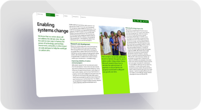 34 Enabling systems change We know that our action alone will not address the climate crisis. We are focused on new ways to harness the power of technology, partnerships, investments, and policy to drive impact at scale and pace to help the world get to carbon zero. At Microsoft we know that our action alone will not address the climate crisis, so we must help develop the markets for carbon abatement approaches. This is a partnership between our operational sustainability program, Climate Innovation Fund, and Microsoft Research to ensure that we are not only procuring and funding the technologies we need to meet our commitments, but also investing in the companies that provide them—and supporting research and development for pre-commercial solutions. Research and development Researchers at Microsoft tackle critical challenges that will shape the future of the world and the company. Given the significa nce of sustainability challenges for our global future, r esearch teams around the world are developing new technologies and approaches to reduce carbon, use comput e resources more efficiently, and bring AI to bear on pro blems from carbon emissions modeling to improvements in renewable energy. Improving reliability of carbon removal projects Afforestation (growth of net new trees) pulls carbon from the atmosphere. Trees on farms can also improve agricultural productivity and provide additional income to farmers through the sale of carbon credits. Buyers of such credits, however, want to ensure that the farmer is properly incentivized to safeguard tree growth over time. Using the lens of contract theory, Microsoft research shows how to calculate the optimal stream of payments over time to ensure incentive alignment. This research can be applied to enlarge the supply of carbon reduction credits, especially outside the developed world. Trees on farms can provide additional income to farmers through the sale of carbon credits. Using contract theory, Microsoft research shows how to calculate the optimal stream of payments to ensure farmers are properly incentivized to safeguard tree growth over time. Reducing the energy impact of AI Many AI tasks, like predicting the next word a person will type, rely on machine learning with neural networks, also known as deep learning. These neural networks can unlock new sustainability solutions, but also can consume a lot of energy. In a new effort, we are building tools for AI developers to predict the energy consumption of a neural network before deployment, so that more compute - and energy-efficient networks can be designed upf ront. We have progressed on other techniques enab ling more efficient networks, including factorizable neu ral operators (FNO), a compression technique that affords reductions in compute and memory requirements. Applied to large-scale language models such as BERT, FNO reduced memory usage by 80 percent and prediction time by 50 percent, with less than a 5 percent reduction in accuracy. Further improvements may be achieved by combining FNO with other model compression methods, such as distillation and quantization. Collaborating with researchers at NVIDIA, we’ve developed a new method to find neural netwo rks that satisfy hardware constraints, such as low power consumption for mobile devices. This highly efficie nt method can find high-performing architectures i n minutes, enabling carbon savings compared to previous methods. We also advanced AI systems research to explicitly optimize for server power reduction, in add ition to capacity efficiency; this work has resulted in a mult i-GWh/year reduction of power consumption for Azure and Microsoft 365.