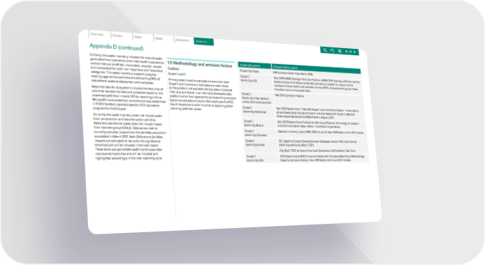 Appendix D (continued) Similarly, the waste inventory includes the mass of waste generated from operations within Microsoft’s operational control that are landfilled, incinerated, recycled, reused, and composted for both non-hazardous and hazardous categories. This waste inventory supports progress tracking against the commitment of diverting 90% of operational waste at datacenters and campuses. Reported data for ecosystems includes the total area of land that has been funded and protected based on the presented definition in table 1.10 for reporting criteria. Microsoft’s land protection commitment was established in FY20 therefore reported data for FY21 represents progress for the first year. Currently the waste inventory does not include waste from construction and deconstruction activities. Reported operational waste does not include impact from business group GitHub. Data across metrics currently excludes impact from the ZeniMax acquisition completed in March 2021. Both GitHub and ZeniMax impacts are estimated to be under the significance threshold and will be included in the next report. These items are part of Microsoft’s continuous data improvement activities and will be included and highlighted accordingly in the next reporting cycle. 1.9 Methodology and emission factors Carbon Scope 1 and 2 Primary data is used to calculate emissions for both Scope 1 and 2 emissions. Estimates are used where primary data is not available. Activity data is collected internally and stored in an internally developed data platform which then applies the corresponding emission factors to calculate emissions. Microsoft uses the IPCC Fourth Assessment when it comes to applying global warming potential values. Scope and source Emissio n f actor source Scope 1 (all f uels) EPA Emission Factor Hub. March 2018. Scope 2 Electricity (US) Year 2019 eGRID Subregion Emission Factors: eGRID 2019, February 2021. For market- based emissions the factors presented are used as needed. For regions where residual emission factors are available we have 100% renewable energy purchases, therefore not currently applicable. Scope 2 Electricity (international unless otherwise sourced) IEA (2021), Emission Factors Scope 2 Electricity (Australia) Year 2020 factors from “Table 46: Scope 2 and 3 emissions factors - consumption of purchased electricity by end users”, emission factors for Scope 2. National Greenhouse Gas Accounts (NGA) Factors, August, 2021. Scope 2 Electricity (Brazil) Year 2020 factors from the Brazilian Ministry of Science, Technology, Innovation and Communication: Fator médio - Inventários corporativos. Scope 2 Electricity (Canada) National inventory report 1990-2019. Annex 13. Year 2019 factors. From 2021 release. Scope 2 Electricity (India) CO 2 : Baseline Carbon Dioxide Emission Database, Version 16.0. India Central Electricity Authority. March 2021. CH 4 /N 2 O: “CO2 Emissions from Fuel Combustion (2021 Edition).” IEA. Paris. Scope 2 Electricity (UK) 2021 Government GHG Conversion Factors for Company Reporting: Methodology Paper for Emission Factors. Year 2019 factors from June 2021 release. 105