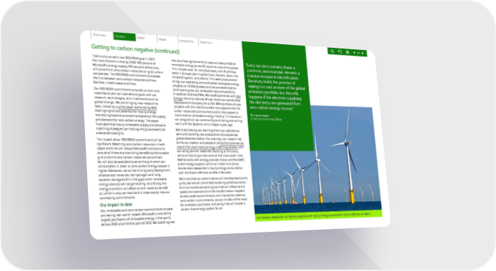 Getting to carbon negative (continued) That is why we set a new 100/100/0 goal in 2021. Our commitment is that by 2030, 100 percent of Microsoft’s energy supply, 100 percent of the time, will come from zero carbon resources on grids where we operate. The 100/100/0 commitment completes the link between zero carbon resources and our facilities in both space and time. Our 100/100/0 commitment provides a vision and roadmap to pair our operational goals with our research, technologies, and investments to drive global change. We are bringing new research to bear, including a white paper authored by RMI that highlights the potential for hourly energy monitoring tools to provide transparency into supply and demand for zero carbon energy. The paper illustrates that hourly renewable supply and demand matching strategies can help lay the groundwork for a decarbonized grid. The impact of our 100/100/0 commitment will be significant. Matching zero carbon resources in both space and time will reduce Microsoft’s emissions to zero at all times and also bring benefits to the broader grid since the zero carbon resources we contract for will also be available to serve the grid when our consumption is lower or zero carbon energy output is higher. Moreover, we will be driving early deployment of advanced resources like hydrogen and long- duration storage to fill in the gaps when renewable energy sources are not generating. And finally, the energy transition will affect all and needs to benefit all, which is why we have built climate equity into our purchasing commitments. Our impact to date Our renewable and zero carbon commitments to date are having real-world impact. Microsoft is one of the largest purchasers of renewable energy in the world. Across 2020 and the first part of 2021, Microsoft signed new purchase agreements for approximately 6 GW of renewable energy across 10 countries around the globe. This includes over 35 individual deals, with 15 of those deals in Europe spanning Denmark, Sweden, Spain, the United Kingdom, and Ireland. This latest procurement brings our operating and contracted renewable energy projects to 7.8 GW globally and we are positioned to continue to grow our renewable resource portfolio. In addition to these PPAs, Microsoft partnered with Volt Energy , the only national African American owned solar de velopment company, for a 250-MW portfolio of solar projects with the intent to create new opportunities for under-resourced communities and to help support a more diverse renewable energy industry. This builds on our progress on our community purchasing and skilling work with Sol Systems, which began a year ago. We ’re also taking our learnings from our operational work and building new products to help accelerate global decarbonization. For example, our research led to the co-creation and adoption of the first commercial round-the-clock hourly energy-matching solution with o ur utility partner Vattenfall. Building on this work, we’re announcing a new around-the-clock pilot in the Netherlands with energy provider Eneco and FlexiDAO, a technology supplier, which will match one of our Amsterdam datacenter’s hourly energy consumption with the Dutch offshore windfarm Borssele. We k now that our actions alone will not decarbonize the grids, but we are committed to taking ambitious action to drive market demand signals that will influence the speed and scale at which the transformation happens. As Microsoft builds the tools and markets to meet our zero carbon commitments, we are mindful of the need for products, purchases, and policy that will enable a carbon-free energy system for all. “Every net zero scenario shares a common, and essential, element: a massive increase in electrification. Electricity holds the promise of wiping out vast sections of the global emissions portfolio, but this only happens if the electrons supplying the electricity are generated from zero carbon energy sources.” Dr. Lucas Joppa Chief Environmental Officer Our Sweden datacenter will be fully supplied with hourly energy consumption with an offshore windfarm. 24