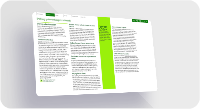 Enabling systems change (continued) Driving collective action Getting to net zero is going to take more than investments, technology, and commitments. We’ll need to use all those together in sectoral and multi- stakeholder organizations that drive full ecosystem change. Microsoft participates in many of these efforts and spearheads work across several, including the following. Transform to Net Zero Transform to Net Zero (TONZ) is a cross-sector initiative to accelerate the transition to a net zero global economy. The group’s 2025 goal is for all Fortune Global 1000 companies to have targets backed up by transformation plans to achieve net zero no later than 2050. TONZ’s strategy is to achieve this through enabling business transformation, taking collective action, and driving systemic change. This includes a focus on demonstrating the transformation of members’ own businesses and inspiring transformation in other companies. Since its initial launch in late 2020, TONZ has released a position paper and action plan to define the group’s position on net zero goals and their implementation, formed decarbonization approaches across key supply chain areas, and published two research reports on the building blocks of net zero and key sectoral challenges. In Q3 2021, TONZ published the first of a set of transformation guides to share lessons learned from TONZ companies on net zero implementation across procurement, net zero goalsetting, and policy engagement. See TONZ Position Paper and Action Plan here Business Alliance to Scale Climate Solutions (BASCS) Launched in 2021, BASCS aims to bridge the gap in climate finance by providing a central platform for businesses and experts to meet, learn, discuss, and act together. As a founding member of the alliance, Microsoft is sharing our resources and experiences as an early adopter of climate solutions, as well as an investor providing catalytic capital for nascent and first-of-a-kind climate solutions. Carbon Removal Climate Action Group Microsoft co-founded the Carbon Removal Climate Action Group of the World Economic Forum (WEF) CEO Climate Leaders Alliance to help raise corporate awareness about the importance of carbon removal. The alliance will also create a due diligence platform and a joint purchasing strategy for carbon removal. Sustainable Aviation Fuel Buyers Alliance (SABA) In April 2021, Microsoft was announced as one of the founding members of SABA. Led by RMI and the Environmental Defense Fund (EDF), SABA will work to accelerate the path to net zero aviation by driving investment in SAF, catalyzing SAF production and technological innovation, and supporting member engagement in policy-making efforts. Playing for the Planet Our gaming business has partnered with the United Nations Environment Programme on the Playing for the Planet initiative. Its goals are to reduce the impact of the gaming ecosystem on the environment through better carbon accounting and educating gamers everywhere on sustainable causes. For example, the Minecraft Build a Better World Initiative delivers in-game content about the need to protect and conserve, and matching funds to charitable organizations focused on conservation. 2025 TONZ’s 2025 goal is for all Fortune Global 1000 companies to have targets backed up by transformation plans to achieve net zero no later than 2050. Green activations in games Mojang have already established themselves in the gaming community as world leaders in social outreach and education. Minecraft: Education Edition has reached millions of students with build challenges to create sustainable cities of the future, and with curriculum aligned lesson plans on climate and environmental themes. Mojang is committed to continued innovation in sustainability with new projects including the UNESCO Global Build Challenge, Climate Futures in partnership with Met Office, and the Sustainable City Map. By integrating green activations in games and supporting the global environmental agenda through initiatives ranging from planting millions of trees to reducing plastic in their products, we believe Xbox can have significant impact in improving the world. Green Software Foundation Microsoft launched the Green Software Foundation in May 2021 alongside Accenture, ThoughtWorks, and GitHub to create green software industry standards, drive awareness, grow advocacy, and accelerate innovation to enable developers to reduce the carbon emissions of the software platforms that they build. The foundation has grown to 20 members and over 350 individual contributors collaborating on standards, innovation, and education. The first version of the Software Carbon Intensity (SCI) standard, a methodology for scoring software applications, was released in December 2021. 39