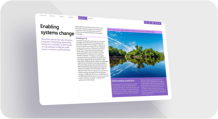 Enabling systems cha nge We are focused on new ways to harness the power of technology, partnerships, investments, and policy to drive impact at scale and pace to help the world protect ecosystems and biodiversity. At Microsoft we know that our actions alone will not be enough to protect ecosystems and biodiversity. The world will need new partnerships, solutions, and policies that have the potential to scale rapidly and globally. Investing in AI To empower organizations working on environmental challenges, we provide training and access to cloud and AI technologies. Since its inception in 2017, our AI for Earth program has provided more than 850 grants to organizations working in 110 countries around the world. While initially these grants provided access to Microsoft cloud services and additional training, we’ve expanded the program to now include the Planetary Computer. This past year, we also added new partners that bring significant new capabilities to the program. We partnered with the Group on Earth Observations (GEO) Secretariat to better reach geospatial researchers and practitioners working at the forefront of environmental use cases. We launched the $1 million GEO-Microsoft Planetary Computer grant program to support early adopters of the Planetary Computer to apply Earth observations to address environmental and societal challenges. We selected the first eight grant recipients in September 2021 who all received access to the NICFI Satellite Data Program on Azure and launched a second request for proposals in October 2021 in partnership with Planet Labs. Monitoring to be able to create more effective reforestation plans and monitor reforestation progress. Deforestation prediction We partnered with Vale and our Brazilian subsidiary to build PrevisIA, a solution for NGO Imazon that anticipates information on regions with a higher risk of deforestation and wildfires in the Amazon Rainforest through AI. The open platform analyzes various data such as topography, land cover, urban infrastructure, official and unofficial roads, and socioeconomic statistics to refine the deforestation risk model and identify the different types of territories threatened by deforestation in the Amazon Rainforest including indigenous lands and conservation units. All the information is publicly disclosed at a control panel. Public bodies, private companies, and civil society can plan and carry out preventive actions, combating and controlling deforestation. 84