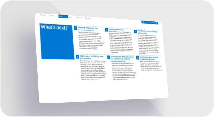 What’s next? 1 Replenish more water than we consume by 2030 We will continue to make progress against our 2030 replenishment commitment. We have prioritized our investments in high- stress locations where we operate and work with partners to identify the right type of replenishment projects that align with the unique challenges in each location. We will continue to prioritize opportunities to partner with other stakeholders, including companies that operate in the same locations. 2 Enable access to drinking water and sanitation We will continue to work with Water.org to make prog ress against our accessibility commitment, providing 1.5 million people with access to clean water by 2030. Our support thus far has focused on Brazil, India, Indonesia, and Mexico, and will expand to include China, Malaysia, and South Africa. We will continue to explore water, sanitation, and hygiene (WASH) solutions that will provide people across the globe with access to clean water and continue to identify opportunities to implement them. 3 Invest in partnerships We will continue to invest in new and existing partnerships that will enable Microsoft to make progress against our commitments and help protect water resources for future generations. Given the collective approach required to solve shared water challenges, we will continue to build on partnerships like the Water Resilience Coalition (WRC) that bring companies together to pool funding and invest in solutions in locations with extreme water stress. We will also continue to support investments through our AI for Earth fund that strengthen water data and drive outcomes. 4 Increase water efficiencies across our operations and identify innovative solutions To drive water use reductions in the short and long term, increasing efficiency is critical and it must be paired with innovation to ensure businesses can continue to operate in an unpredictable future with increasing water challenges. As we identify innovative approaches that work, we look forward to scaling these within Microsoft and sharing them outside of our four walls to further reduce pressure on the shared water resources we depend on. 5 Evaluate water impacts beyond our operations We recognize that water is a challenge not just across our operational footprint, but also across our value chain. We will continue to explore ways we can support suppliers in understanding and managing their water risks. We also recognize that water and energy are interlinked. Energy is required to pump and transport water and similarly water is required to produce electricity. We will continue to strengthen our understanding of the ways our energy procurement decisions can affect water resources. 6 Identify technology adoption opportunities for water We will use the investment from our Climate Innovation Fund into Emerald Technology Ventures to identify technology adoption opportunities for emerging water technologies that can help Microsoft achieve our water positive commitment and support our customers. 59