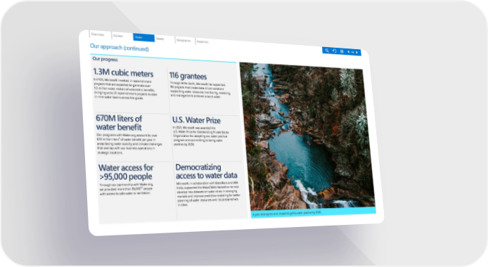 Our approach (continued) Our progress 1.3M cubic meters In FY21, Microsoft invested in replenishment projects that are expected to generate over 1.3 million cubic meters of volumetric benefits, bringing us to 21 replenishment projects to date in nine water basins across the globe. 670M liters of water benefit Our programs with Water.org account for over 670 mi llion liters 9 of water benefit per year in areas facing water scarcity and climate challenges that overlap with our business operations in strategic locations. Water access for >95,000 people Through our partnership with Water.org , we prov ided more than 95,000 10 people with access to safe water or sanitation. 116 grantees Through AI for Earth, Microsoft has supported 116 projects that create data-driven solutions supporting water resources monitoring, modeling, and management centered around water. U.S. Water Prize In 2021, Microsoft was awarded the U.S. Water Prize for Outstanding Private Sector Organization for adopting our water positive program and committing to being water positive by 2030. Democratizing access to w ater data Microsoft, in collaboration with BlackRock and WRI India, supported the Wave2Web Hackathon to help develop new datasets on water stress in emerging markets and improve predictive modeling for better planning of water resources and risk preparedness in cities. A year of progress and impact to get to water positive by 2030. 46