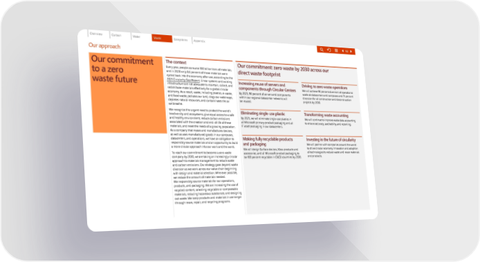 Our approach Our commitment to a zero waste future The context Every year, people consume 100 billion tons of materials, and in 2020 only 8.6 percent of those materials were cycled back into the economy after use, according to the 2021 Circularity Gap Report . Linear systems and existing infrastructure are not adequate to maintain, collect, and redistribute materials effectively for a global circular economy. As a result, waste, including plastics, e-waste, and food waste, pollutes our land, clogs our waterways, depletes natural resources, and contaminates the air we breathe. We recog nize the urgent need to protect the world’s biodiversity and ecosystems, give equal access to a safe and healthy environment, reduce carbon emissions associated with the creation and end-of-life of these materials, and meet the needs of a growing population. As a company that makes and manufactures devices, as well as uses manufactured goods in our campuses, datacenters, and operations, we have an obligation to responsibly source materials and an opportunity to build a more circular approach into our work and the world. To reach our commitment to become a zero waste company by 2030, we are taking an increasingly circular approach to materials management to reduce waste and carbon emissions. Our strategy goes beyond waste diversion as we work across our value chain beginning with design and material selection. Wherever possible, we reduce the amount of materials needed. We responsibly source materials for our operations, products, and packaging. We are increasing the use of recycled content, selecting recyclable or compostable materials, reducing hazardous substances, and designing out waste. We keep products and materials in use longer through reuse, repair, and recycling programs. Our com mitment: zero waste by 2030 across our direct waste footprint Increasing reuse of servers and components through Circular Centers By 2025, 90 percent of servers and components within our regional datacenter networks will be reused. Eliminating single-use plastic By 2025, we will eliminate single-use plastics in all Microsoft primary product packaging and all IT asset packaging in our datacenters. Making fully recyclable products and packaging We will design Surface devices, Xbox products and accessories, and all Microsoft product packaging to be 100 percent recyclable in OECD countries by 2030. Driving to zero waste operations We will achieve 90 percent diversion of operational waste at datacenters and campuses and 75 percent diversion for all construction and deconstruction projects by 2030. Transforming waste accounting We will continue to improve waste data accounting to ensure accuracy, auditability, and reporting. Investing in the future of circularity We will partner with companies around the world to drive circular economy innovation and adoption of technologies to reduce waste and reuse materials and products. 62