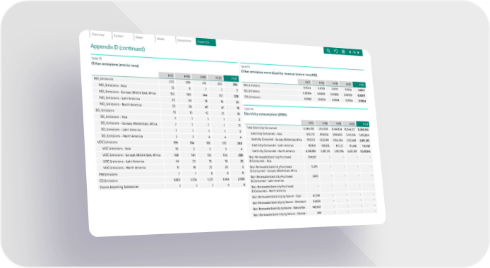 Table 12 Other emissions (metric tons) FY17 FY18 FY19 FY20 FY21 NO x Emissions 223 209 215 202 284 NO x Emissions – Asia 13 6 7 7 7 NO x Emissions – Europe, Middle East, Africa 152 145 144 137 226 NO x Emissions – Latin America 25 24 16 16 35 NO x Emissions – North America 33 34 49 41 16 SO x Emissions 13 13 12 12 18 SO x Emissions – Asia 2 1 1 1 2 SO x Emissions – Europe, Middle East, Africa 7 7 7 7 11 SO x Emissions – Latin America 1 1 1 1 2 SO x Emissions – North America 3 3 4 4 4 VOC Emissions 199 184 185 170 248 VOC Emissions – Asia 10 3 5 5 4 VOC Emissions – Europe, Middle East, Africa 148 141 133 124 208 VOC Emissions – Latin America 24 23 15 16 35 VOC Emissions – North America 17 16 32 26 2 PM Emissions 7 7 8 8 11 CO Emissions 1,860 1,704 1,721 1,584 2,392 Ozone Depleting Substances 1 1 1 0 0 Appendix D (continued) Table 13 Other emissions normalized by revenue (metric tons/M$) FY17 FY18 FY19 FY20 FY21 NO x Emissions 0.0023 0.0019 0.0017 0.0014 0.0017 SO x Emissions 0.00014 0.00011 0.00010 0.00009 0.00011 CH 4 Emissions 0.0005 0.0004 0.0004 0.0004 0.0004 Table 14 Electricity consumption (MWh) FY17 FY18 FY19 FY20 FY21 Total Electricity Consumed 6,344,700 7, 357, 636 8 ,74 4 , 83 4 10,244,377 12,969,393 Electricity Consumed – Asia 682,713 804,024 1,066,033 1,225,534 1,473,254 Electricity Consumed – Europ e, Middle East, Africa 971,073 1,265,961 1,654,384 2,102,486 2,801,332 Electricity Consumed – Latin America 90,929 106,936 117,222 113,456 174 ,762 Electricity Consumed – North America 4,599,985 5,180,715 5,907,195 6,802,901 8,520,045 Non-Renewable Electricity Purchased & Con sumed – Asia 204,937 – – – – Non-Renewable Electricity Purchased & Con sumed – Europe, Middle East, Africa 17, 39 1 – – – – Non-Renewable Electricity Purchased & Con sumed – Latin America 3,603 – – – – Non-Renewable Electricity Purchased & Con sumed – North America – – – – – Non-Renewable Electricity by Source – Coal 4 2 ,74 6 – – – – Non-Renewable Electricity by Source – Petr oleum 34,058 – – – – Non-Renewable Electricity by Source – Natur al Gas 148,643 – – – – Non-Renewable Electricity by Source – Nuclear 484 – – – – 114