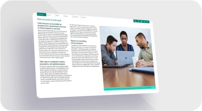 How we work (continued) Hold everyone accountable for progress and a governance structure to track progress in real time Governance and accountability are critical to ensuring alignment and prioritization across your business. At Microsoft, we hold our business groups accountable for their carbon emissions via an internal carbon fee of $15 per metric ton. In January 2021, we expanded the carbon fee so that it includes Scope 3 emissions from our supply and value chain, in addition to Scope 1 and Scope 2. We set measurements and scorecards for each business group’s sustainability commitments across the company and review progress twice a year. We have established a Climate Council that includes senior business leaders from every business group to provide sustainability advice, collaborate, drive alignment, prioritize resources and funding, and review progress on our commitments. We also tie a portion of our executive incentive plan to our carbon reduction goals. Take steps to accelerate markets, ecosystems, and global progress If the world is going to meet net zero goals by 2050, companies need to use their entire ecosystem and all of their positions of influence. In addition to taking accountability for our operational footprint across carbon, water, waste, and ecosystems, Microsoft is deploying capital, supporting innovation, and advocating for larger policy change. We led the largest corporate carbon removal RFP last year, spending our dollars to drive the carbon removal market forward and to address our own needs. Our $1 billion Climate Innovation Fund is investing in organizations across our areas of commitment to build a larger, more robust ecosystem of effective companies and solutions. Our sponsorship at COP26 and numerous engagements with governments at the city, regional, state, and national levels are aimed at creating policy environments that further accelerate the impact of this work and the transition to net zero. Report on everything, not just progress Transparency is both embedded in each step and a specific commitment. In this report, as well as other white papers, methodology papers, and speaking engagements, Microsoft is committed to sharing our learnings with the world. When things go well, we will share that as well as the playbooks to follow to achieve similar results outside our organization. And if things go less well, we will share that too so we can all learn and grow together. We are also delivering innovative technology and services to help our customers and partners power environmental sustainability. And we go beyond that with our biggest bets in policy, investment, catalytic partnerships, and research and development. Sustainable digital transformations require both strategic frameworks and cultural buy-in to be successful. 8