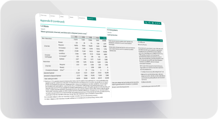 Appendix D (continued) 1.4 Waste Table 9 Waste generated, diverted, and directed to disposal (metric tons) 17 FY17 FY18 FY19 FY20 FY21 Non-Hazardous 23,870 17, 6 61 31,644 31,101 20,768 Diverted Reused 325 4 0 715 1,136 2,171 Recycled 14 ,9 55 9,824 10,460 8,452 9,589 Comp osted 5,920 5,883 8,358 10,104 1,776 Subtotal 21,200 15 , 747 19,5 3 3 19,691 13 , 536 Directed to Disp osa l Landfilled 2,044 1,599 11,713 10,8 4 8 6,9 57 I ncinerated 18 626 316 398 562 275 Subtotal 2,67 1 1 ,915 12,111 11,410 7, 232 Haz a rdous 2,188 1, 405 14 ,534 9, 4 69 1,750 Di verted Recy cled 2,122 1,376 6,1 84 7, 5 8 1 1, 74 2 Re u sed – – 1,096 1,88 0 0 Direct ed to Disposal Other 19 66 29 7, 25 4 8 8 Diverted S ubtota l 23,322 1 7,12 3 26, 8 1 3 29,152 15,2 7 8 Directed to D isposal Subtotal 2,737 1,944 19,365 11,418 7, 24 0 Total waste gen e rated 26,059 19,066 46,178 40,570 22,518 17 Starting in FY19, reported values encompass global data across Microsoft's direct waste footprint, including estimates where needed, except for waste from construction and deconstruction and GitHub which is currently not reported and will be part of data improvements going forward. Waste generation values and classifications have been updated for FY19 and FY20 to be consistent with data collection, reporting boundary, and estimation methodology improvements established in FY21. Reported data back to FY19 was adjusted to represent waste streams only within Microsoft’s operational control boundary, and as such, properly exclude disposition of packaging from our sold products. Data for reuse or other diversion methods besides recycling for hazardous waste, and other disposal operations besides landfilled and incineration for non-hazardous waste is currently not applicable and will be part of data improvements going forward if they become applicable. As waste accounting continues to improve, reported values may change. Reported waste data is mainly directed for disposal offsite. 18 Incinerated category under non-hazardous includes incineration with and without energy recovery. 19 'Other' category under hazardous includes landfilled and incinerated with and without energy recovery waste. 1.5 Ecosystems Table 10 Land protection FY21 Total size and country location of all habitat areas selected for protection for which contributions were made US: 4,998 acres Belize: 12,270 acres A description of partnerships for which contributions were made that exist with third parties to protect habitat areas Since making this commitment in April 2020, Microsoft identified two leading land protection organizations, the National Fish and Wildlife Foundation (NFWF) within the United States and The Nature Conservancy (TNC) globally, to partner with to achieve the commitment to protect more land than we use. A data-informed approach to identify ecosystems most at risk was used, using TNC’s last chance ecosystem framework and NFWF’s national landscape conservation framework. Within each of the two partnerships the following organizations will hold the conservation easement/ own the protected land: • The Nature Conservancy: Belize Maya Forest Trust • National Fish and Wildlife Foundation: Montana Department of Fish, Wildlife, and Parks; New Mexico Land Conservancy, Rocky Mountain Elk Foundation for the US. Total acres categorized by the status at the close of the reporting period as either (i) funded or (ii) protected 17,268 acres (funded) Period in which funding occurred As of the fiscal year ended June 30, 2021 103