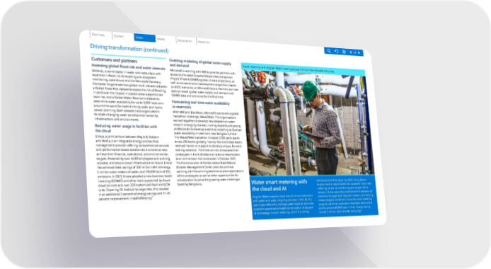 - Driving transformation (continued) Customers and partners Assessing global flood risk and water reserves Deltares, a world leader in water and subsurface with expertise in flood risk fo recasting and ecosystem monitoring, used Az ure and the Microsoft Planetary Computer to generate two global multi-decade datasets: a Global Flood Risk data set to assess the risk of flooding, in particular the impa ct in coastal areas subject to sea level rise, and a Global Water Reservoirs dataset to determine water availability for up to 3,000 reservoirs around the world for both drinking water and hydro power planning. Both datasets help organizations to relate changing water conditions to humanity, infrastructure, and environments. Reducing water usage in facilities with the cloud Enova, a joint venture between Majid Al Futtaim and Veolia, is an integrated energy and facilities management provider offering comprehensive services and performance-based solutions to its clients to help achieve their financ ial, operational, and environmental targets. Powered by o ver 4,500 employees and a strong, scalable, and secure cloud infrastructure on Azure, Enova has achieved total savings of 320 million kWh of energy, 5 million cubic meters of water, and 210,000 tons of CO 2 emissions. In 2021, Enova adopted a new business model involving ICONICS and other tools supported by Azure cloud services and over 320 customized fault and ECM rules. Covering 28 medium to large sites, this resulted in an additional 2 percent of energy savings and 17–25 percent improveme nt in staff efficiency. 8 Enabling modeling of global water supply and demand Microsoft is working with WRI to provide partners with access to the latest Coupled Model Intercomparison Project Phase 6 (CMIP6) global climate projections, as well as socioeconomic development projections based on IPCC scenarios, on Microsoft Azure. Partners are now able to model global water supply and demand with CMIP6 data and scenar ios for the first time. Forecasting real-time water availability in reservoirs With WRI and BlackRock, Microsoft sponsored a global hackathon challenge, Wave2Web. The organizations worked together to develop new datasets on water stress in emerging markets, inviting students and young professionals to develop predictive modeling to forecast water availability in reservoirs near Bengaluru, India. The Wave2Web hackathon included 2,130 participants across 293 teams glob ally. Twenty-five shortlisted teams received hands-on su pport to develop unique, forward- looking solutions. The three winners showcased their prototypes in front of state and national stakeholders at an online town hall conducted in October 2021. The Commissioner of the Karnataka State Natural Disaster Management Center plans to continue working with the winning teams to explore applications of the prototypes as well as other opportunities for collaboration to solve the growing water challenges faced by Bengaluru. Smart metering with Anglian Water is saving almost 3 million liters of water every day. Water smart metering with the cloud and AI Anglian Water supplies more than 6 million customers with water and water recycling services in the UK. It is working to efficiently manage water supplies and raise customer awareness of water conservation. A key part of its strategy is smart metering, which it is rolling out across its entire region by 2030. Using Azure, Anglian built a robust system for customer - side smart metering, as well as monitoring and analysis of its network. It also uses AI to understand the behavior of reservoirs through each day, each season, and varying meteorological conditions. Since the smart metering program went live, customers have been able to find and fix around 40,000 leaks in their homes, saving almost 3 million liters of water every day. 8 54