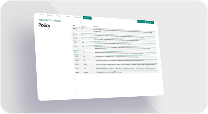 Appendix E (continued) Date Market Description May-21 US Filed comments to the Securities and Exchange Commission supporting the Commission's development and adoption of climate disclosure rules. May-21 US Participated in US Congressional Climate Infrastructure Lobby Day to support robust domestic climate policy. Jun-21 US Supported clean energy and climate provisions in the US Infrastructure Investment and Jobs Act. Jul-21 EU Issued statement in support of the European Commission’s Fit for 55 package. Jul-21 US Participated in US Congressional Lobby Day for robust climate and energy investment in the bipartisan infrastructure and reconciliation packages. Aug-21 EU Submitted comments to European Commission in support of a carbon removal certification mechanism. Sept-21 UK Filed response to UK Financial Conduct Authority (FCA) consultation on carbon accounting. Sept-21 US Submitted comments to the US Department of Defense on sustainability and climate-related disclosure. Oct-21 Global Joined business letter in support of strong government commitments to climate action by national governments around the world. Oct-21 US Issued public statement in support of strong climate and clean energy provisions in the US reconciliation and infrastructure bills. Nov-21 Global Selected as a Principal Partner for COP26 in Glasgow. Policy 118