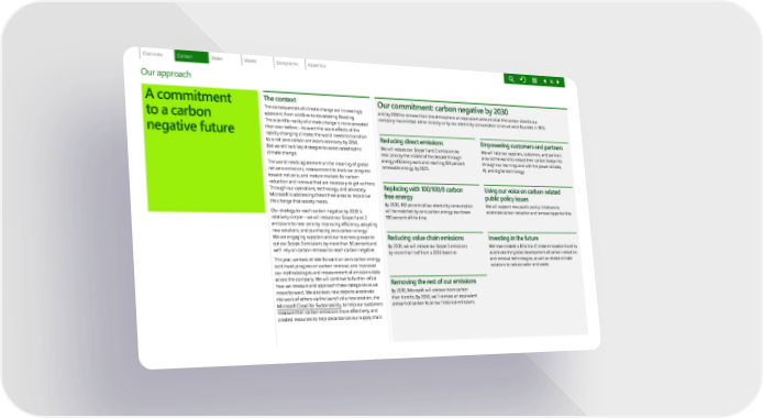 Our approach A commitment to a carbon negative future The context The consequences of climate change are increasingly apparent, from wildfires to devastating flooding. The scientific reality of climate change is more accepted than ever before—to avert the worst effects of the rapidly changing climate, the world needs to transition to a net zero carbon emissions economy by 2050. But we still lack key strategies to avoid catastrophic climate change. The world needs agreement on the meaning of global net zero emissions, measurement to track our progress toward net zero, and mature markets for carbon reduction and removal that are necessary to get us there. Through our operations, technology, and advocacy, Microsoft is addressing these three areas to help drive the change that society needs. Our strategy to reach carbon negative by 2030 is relatively simple—we will reduce our Scope 1 and 2 emissions to near zero by improving efficiency, adopting new solutions, and purchasing zero carbon energy. 1 We are engaging suppliers and our business groups to cut our Scope 3 emissions by more than 50 percent and we’ll rely on carbon removal to reach carbon negative. This year, we took strides forward on zero carbon energy, continued progress on carbon removal, and improved our methodologies and measurement of emissions data across the company. We will continue to further refine how we measure and approach these categories as we move forward. We also took new steps to accelerate the work of others via the launch of a new solution, the Microsoft Cloud for Sustainability , to help our customers measure their carbon emissions more effectively, and created resources to help decarbonize our supply chain. Our commitment: carbon negative by 2030 and by 2050 to remove from the atmosphere an equivalent amount of all the carbon dioxide our company has emitted either directly or by our electricity consumption since we were founded in 1975. Reducing direct emissions We will reduce our Scope 1 and 2 emissions to near zero by the middle of the decade through energy efficiency work and reaching 100 percent renewable energy by 2025. Replacing with 100/100/0 carbon free energy By 2030, 100 percent of our electricity consumption will be matched by zero carbon energy purchases 100 percent of the time. Reducing value chain emissions By 2030, we will reduce our Scope 3 emissions by more than half from a 2020 baseline. Removing the rest of our emissions By 2030, Microsoft will remove more carbon than it emits. By 2050, we ́ll remove an equivalent amount of carbon to all our historical emissions. Empowering customers and partners We will help our suppliers, customers, and partners around the world to reduce their carbon footprints through our learnings and with the power of data, AI, and digital technology. Using our voice on carbon-related public policy issues We will support new public policy initiatives to accelerate carbon reduction and removal opportunities. Investing in the future We have created a $1 billion Climate Innovation Fund to accelerate the global development of carbon reduction and removal technologies, as well as related climate solutions to reduce water and waste. 16