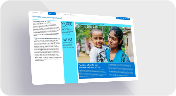Getting to water positive (continued) Improving access to water With 1.1 billion people in the world without access to clean water, it’s not enough to simply reduce and replenish—we need to improve people’s access to safe, clean water. Our goal is to provide access to safe drinking water and improved sanitation solutions for 1.5 million people while accounting for 25 billion liters of net positive water impact in high-stress watersheds where we also operate, namely India, Indonesia, and Mexico, by 2030. Progressing towards our goal with Water.org In 2020, we began our work with Water.org to help people living in u nderserved communities gain lasting and reliable access to safe drinking water and improved sanitation solutions. This includes household taps and toilets, piped connections, rainwater harvesting, water storage, purifi cation, and community filtration. In FY21, we helped more th an 95,000 people in India and Indonesia 10 and expect to reach at least 840,000 people by Septembe r 2023. Nearly all the beneficiaries are women and live below t he poverty line. These programs account for over 670 million liters of water benefit per year in areas f acing water scarcity and climate challenges that over lap with our business operations in strategic locations. 9 95,000 Through our partnership with Water.org , we provided more than 9 5,000 people with access to safe water or sanitation. 670M Programs run through Water.org account for over 670 million lite rs of water benefit per yea r. Affordable water and sanitation loans in India for piped water in homes. Providing safe water and improved sanitation in India In Rasulpur Aul Kendrapara, houses are made of thatch, mud, and concrete, and rarely have water or sanitation connections. Rehana and her daughter used to walk up to six hours a day to get water for cooking, laundry, and baths from an unreliable hand-pump managed by the government. On days it was unavailable, they collected water from the river or purchased it from a vendor, paying high prices for water in time and money. Families like Rehana’s find the small water and sanitation loans offered by Water.org ’s partners in India to be affordable, practical solutions to their fam ily’s water and sanitation needs. Rehana learned that she could make affordable payments to establish a water connection and was approved for a loan to construct a piped water connection from the municipal water line to her home. Now the family enjoys access to safe water and improved sanitation at home. 52 Affordable water and sanitation loans in India for piped water in homes.