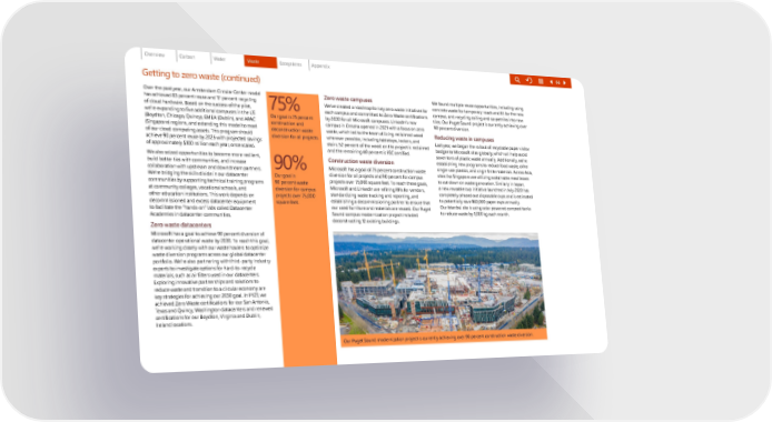 66 Getting to zero waste (continued) Over the past year, our Amsterdam Circular Center model has achieved 83 percent reuse and 17 percent recycling of cloud hardware. Based on the success of the pilot, we’re exp anding to five additional campuses in the US (Boydton , Chicago, Quincy), EMEA (Dublin), and APAC (Singapore) regions, and extending this model to most of our cloud computing assets. This program should achieve 90 percent reuse by 2025 with projected savings of approximately $100 million each year, once scaled. We also sei zed opportunities to become more resilient, build better ties with communities, and increase collaboration with upstream and downstream partners. We’re bridging the skills divide in our datacenter communities by supporting technical training programs at community colleges, vocational schools, and other education institutions. This work depends on decommissioned and excess datacenter equipment to facilitate the “hands-on” labs called Datacenter Academies in datacenter communities. Zero waste datacenters Microsoft has a goal to achieve 90 percent diversion of datacenter operational waste by 2030. To reach this goal, we’re working closely with our waste haulers to optimize waste diversion programs across our global datacenter portfolio. We’re also partnering with third-party industry experts to investigate options for hard-to-recycle materia ls, such as air filters used in our datacenters. Explori ng innovative partnerships and solutions to reduce waste and transition to a circular economy are key strategies for achieving our 2030 goal. In FY21, we achieve d Zero Waste certifications for our San Antonio, Texas and Q uincy, Washington datacenters and renewed certifica tions for our Boydton, Virginia and Dublin, Ireland l ocations. 75% Our goal is 75 percent construction and deconstruction waste diversion for all projects. 90% Our goal is 90 percent waste diversion for campus projects over 75,000 square feet. Zero waste campuses We’ve created a roadmap for key zero waste initiatives for each camp us and committed to Zero Waste certifications by 2030 for a ll Microsoft campuses. LinkedIn’s new campus in Omaha opened in 2021 with a focus on zero waste, which led to the team utilizing reclaimed wood wherever possible, including tabletops, lockers, and stairs. 52 percent of the wood on the project is reclaimed and the rem aining 48 percent is FSC certified. Construction waste diversion Microsoft has a goal of 75 percent construction waste diversion for all projects and 90 percent for campus projects over 75,000 square feet. To reach these goals, Microso ft and LinkedIn are refining RFIs for vendors, standar dizing waste tracking and reporting, and establishing a decommissioning partner to ensure that our used furniture and materials are reused. Our Puget Sound campus modernization project included deconstructing 12 existing buildings. We found mu ltiple reuse opportunities, including using concret e waste for temporary roads and fill for the new campus, a nd recycling ceiling and carpet tiles into new tiles. Our Puget Sound project is currently achieving over 90 percent diversion. Reducing waste in campuses Last year, we began the rollout of recyclable paper visitor badges to Microsoft sites globally, which will help avoid seven tons of plastic waste annually. Additionally, we’re establishing new programs to reduce food waste, other single- use plastics, and virgin finite materials. Across Asia, sites lik e Singapore are utilizing sustainable meal boxes to cut down on w aste generation. Similarly in Japan, a new reusable cup initiative launched in July 2020 has complet ely phased out disposable cups and is estimated to potentially save 960,000 paper cups annually. Our Istanbul site is using solar powered compost tanks to reduce waste by 1,000 kg each month. Our Puget Sound modernization project is currently achieving over 90 percent construction waste diversion.