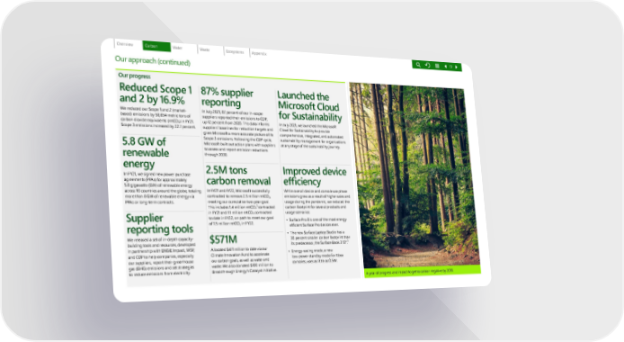 Our progress Reduced Scope 1 and 2 by 16.9% We reduced our Scope 1 and 2 (market- based) emissions by 58,654 metric tons of carbon dioxide equivalents (mtCO 2 ) in FY21. Scope 3 emissions increased by 22.7 percent. 5.8 GW of renewable energy In FY21, we signed new power purchase agreements (PPAs) for approximately 5.8 gigawatts (GW) of renewable energy across 10 countries around the globe, totaling more than 8 GW of renewable energy via PPAs or long-term contracts. Supplier reporting to ols We released a set of in-depth capacity- building tools and resources, developed in partnership with ENGIE Impact, WSP, and CDP to help companies, especially our suppliers, report their greenhouse gas (GHG) emissions and set strategies to reduce emissions from electricity. 87% supplier reporting In July 2021, 87 percent of our in-scope suppliers reported their emissions to CDP, up 12 percent from 2020. This data informs suppliers’ baselines for reduction targets and gives Microsoft a more accurate picture of its Scope 3 emissions. Following the CDP cycle, Microsoft built out action plans with suppliers to assess and report emission reductions through 2030. 2.5M tons carbon removal In FY21 and FY22, Microsoft successfully contracted to remove 2.5 million mtCO 2 , meeting our cumulative two-year goal. This includes 1.4 million mtCO 2 2 contracted in FY21 and 1.1 million mtCO 2 contracted to date in FY22, on path to meet our goal of 1.5 million mtCO 2 in FY22. $571M Allocated $471 million to date via our Climate Innovation Fund to accelerate our carbon goals, as well as water and waste. We also donated $100 million to Breakthrough Energy’s Catalyst initiative. Launched the Microsoft Cloud for Sustainability In July 2021, we launched the Microsoft Cloud for Sustainability to provide comprehensive, integrated, and automated sustainability management for organizations at any stage of the sustainability journey. Our approach (continued) Improved device efficiency While overall device and console use phase emissions grew as a result of higher sales and usage during the pandemic, we reduced the carbon footprint for several products and usage scenarios: • Surface Pro 8 is one of the most energy efficient Surf ace Pro devices ever. • The new Surface Laptop Studio has a 30 percent smaller carbon footprint than its predecessor, the Surface Book 3 13” . 3 • Energy-saving mode, a new low-power standby mode for Xbox consoles, uses as little as 0.5W. A year of progress and impact to get to carbon negative by 2030. 17