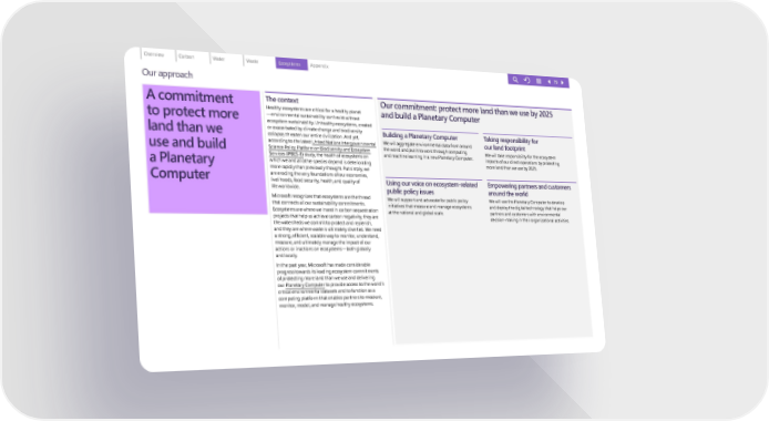 Our approach A commitment to protect more land than we use and build a Planetary Computer The context Healthy ecosystems are critical for a healthy planet —environmental sustainability can’t exist without ecosystem sustainability. Unhealthy ecosystems, created or exacerbated by climate change and biodiversity collapse, threaten our entire civilization. And yet, according to the latest United Na tions Intergovernmental Science Policy Platform on Biodiversity and Ecosystem Services (IPBES-8) study, the health of ecosystems on which we and all other species depend is deteriorating more rapidly than previously thought. Put simply, we are eroding the very foundations of our economies, livelihoods, food security, health, and quality of life worldwide. Microsoft r ecognizes that ecosystems are the thread that connects all our sustainability commitments. Ecosystems are where we invest in carbon sequestration projects that help us achieve carbon negativity, they are the watersheds we commit to protect and replenish, and they are where waste is ultimately diverted. We need a strong, efficient, scalable way to monitor, understand, measure, and ultimately manage the impact of our actions or inactions on ecosystems—both globally and locally. In the past year, Microsoft has made considerable progres s towards its leading ecosystem commitments of protecting more land than we use and delivering our Planetary C omputer to provide access to the world’s critical environmental datasets and to function as a computing platform that enables partners to measure, monitor, model, and manage healthy ecosystems. Our commi tment: protect more land than we use by 2025 and build a Planetary Computer Building a Planetary Computer We will aggregate environmental data from around the world and put it to work through computing and machine learning in a new Planetary Computer. Using our voice on ecosystem-related public policy issues We will support and advocate for public policy initiatives that measure and manage ecosystems at the national and global scale. Taking responsibility for our land footprint We will take responsibility for the ecosystem impacts of our direct operations by protecting more land than we use by 2025. Empowering partners and customers around the world We will use the Planetary Computer to develop and deploy the digital technology that helps our partners and customers with environmental decision-making in their organizational activities. 79