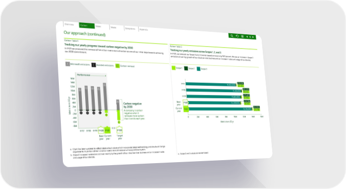 Microsoft emissions Avoided emissions Carbon removal A B C Scope 1 Scope 2 Scope 3 Performance Carbon negative by 2030 A company is carbon negative when it removes more carbon than it emits each year. 12M 10M 8M 6M 4M 2M -2M -4M -6M -8M FY17 FY18 FY19 FY30 FY21 FY20 Current year Base year Tar ge t year 0 14M 16M A A A A A A B B B B Metric tons CO 2 e C C Base year 2M 4M 6M 8M 10M 12M 14M Metric tons CO 2 e 16M 0 FY18 FY17 FY20 FY21 FY19 Current year 10,662,000 139,066 107,452 11,745,000 183,329 99,008 11,466,000 275,420 117,956 11,239,000 13,785,000 163,935 123,704 228,194 118,10 0 Carbon Table 1 Tracking our yearly progress toward carbon negative by 2030 In FY21 we procured the removal of 1.4 million metric tons of carbon as one of our initial steps towards achieving our 2030 commitment. a. Chart has been updated to reflect latest actual values which incorporate latest methodology and structural change adjustments. A portion of the 1.4 million metric tons of removal will apply to future years. b. Overall increase in emissions is driven mainly by the growth of our cloud services business and an increase in sales and usage of our devices. Carbon Table 2 Tracking our yearly emissions across Scopes 1, 2, and 3 Our approach (continued) In FY21, we reduced our Scope 1 and 2 (market-based) emissions by 16.9 percent. We saw an increase in Scope 3 emissions driven by growth of our cloud services business and an increase in sales and usage of our devices. a. Scope 2 and 3 va lues are market-based. 17 18
