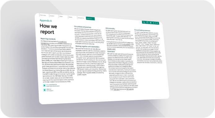 Appendix A How we report Reporting standards Our Reports Hub available at microsoft.com/ transparen cy provides a consolidated, comprehensive view of our ESG reporting and data ranging from our carbon footprint to workforce demographics to political donations. This Environmental Sustainability Report is an important part of that overall set of disclosures. For this and other reports, we inform our disclosure strategies with careful consideration of commonly used global standards such as sector-based materiality maps provided by the Sustainable Accounting Standards Board (SASB), the United Nations Guiding Principles on Business and Human Rights Reporting Framework, and the UN Sustainable Development Goals. We presented greenhouse gas emissions in accordance with the GHG Protocol and select environmental metrics that reference the Global Reporting Initiative Standards (GRI). We have been reporting to CDP since 2010, consistently making it to CDP Climate Change A-list and earning the highest band of A and A- for CDP Water Security since 2016. On climate-related issues, we are committed to fully aligning with the recommendations of the Task Force on Climate-related Financial Disclosures (TCFD). Our commitment to sustainable development Read our TCFD report Our policies and practices We work to apply the power of technology to earn and sustain the trust of the customers and partners we empower and the communities in which we live and work. This focus extends to our work to build a sustainable future where everyone has access to the benefits and opportunities that technology can bring. It’s central to our mission to empower every person and organization to achieve more, and it ́s why many of our employees come to work every day. Working together with stakeholders We know that the decisions we make affect our employees, customers, partners, shareholders, suppliers, and communities, and we take their voices into account. Microsoft receives input from millions of people each year—from individual customers to policymakers and global human rights specialists. We bring outside perspectives into the company and inform our business decisions through a variety of feedback channels. We go beyond formal channels, proactively engaging with key stakeholders, advocacy groups, industry experts, corporate social responsibility (CSR) rating agencies, CSR-focused investors, and many others. We also share our learnings and practices thereby generating industry dialogue, informing public debate, and advancing greater progress. ESG materiality Our ESG reporting describes those topics which we consider to be the most important to stakeholders when evaluating environmental, social, and governance issues at Microsoft. Therefore, ESG materiality in our reporting does not directly correspond to the concept of materiality used in securities law. A listing of what we currently identify and categorize as our top ESG issues can be found on our website . In 2020, Microsoft conducted a materiality assessment focused on environmental sustainability, which can be accessed in last year's report . Governance Microsoft has made sustainability part of its business, including embedding it deeply into its governance structure. Our Board of Directors provides insight, feedback, and oversight across a broad range of environmental and social matters. In particular, the responsibilities of the Board’s Regulatory and Public Policy Committee include providing oversight and guidance to the Board and management about the company’s policies and programs that relate to corporate social responsibility, including the company’s environmental sustainability strategy and commitments. Microsoft’s management team understands that sustainability performance is linked in myriad ways to the company’s long-term financial performance and growth that is sustainable in every sense of the word. We are committed to building and executing on strategies to help foster a healthy planet and advance a more inclusive economy that fosters additional growth opportunities for everyone. Additional information about our governance structure for sustainability can be found in our TCFD report as well as our CDP responses . Forward-looking statements This report includes estimates, projections, and other “forward-looking statements” within the meaning of the Private Securities Litigation Reform Act of 1995, section 27A of the Securities Act of 1933, and section 21E of the Securities Exchange Act of 1934. These forward- looking statements generally are identified by the words “believe,” “project,” “expect,” “anticipate,” “estimate,” “intend,” “strategy,” “future,” “opportunity,” “plan,” “may,” “should,” “will,” “would,” “will be,” “will continue,” “will likely result,” and similar expressions. Forward-looking statements are based on current expectations and assumptions that are subject to risks and uncertainties that may cause actual results to differ materially. We describe risks and uncertainties that could cause actual results and events to differ materially in our reports filed with the Securities and Exchange Commission. We undertake no obligation to update or revise publicly any forward-looking statements, whether because of new information, future events, or otherwise. 91