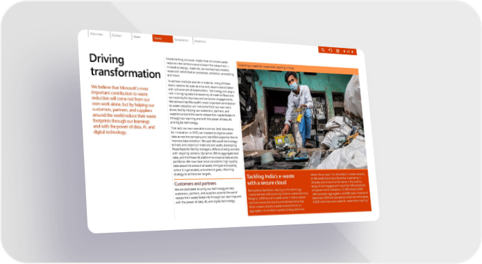 Driving transformation We believe that Microsoft’s most important contribution to waste reduction will come not from our own work alone, but by helping our customers, partners, and suppliers around the world reduce their waste footprints through our learnings and with the power of data, AI, and digital technology. Implementing a circular model that minimizes waste requires interventions up and down the value chain— innovative design, materials, service business models, reuse and redistribution processes, collection, processing, and more. To achieve multipl e uses for a material, many of these levers need to be used at once and require coordination with a diverse set of stakeholders. Technology can play a role in bringing dat a transparency of material flows and connectivity for bu siness and consumer engagements. We believe that Microsoft’s most important contribution to waste reduction will not come from our own work alone, but by helping our customers, partners, and suppliers around the world reduce their waste footprint through our learning and with the power of data, AI, and digital technology. That said, our own ope rations are our best laboratory for innovation. In FY21, we invested to digitize waste data across the comp any and identified opportunities to improve data collec tion. We used Microsoft technology to track and report on materials and waste, developing PowerApps for facility managers, APIs to directly connect with recycling vendors, Dynamics 365 to aggregate bulk data, and the Power BI platform to visualize data across portfolios. We now have more consistent, high-quality data about the amount of waste, the type and quality, where it is generated, and where it goes, informing strategy to achieve our targets. Customers and partners We are dedicated to using our technology to help customers, partners, and suppliers around the world reduce their waste footprints through our learnings and with the power of data, AI, and digital technology. Collecting e-waste for responsible recycling in India. Tackling India’s e-waste with a secure cloud Startup Karo Sambhav is taking on the seemingly impossible task of formalizing India’s e - waste economy. Roughly 7,200 tons of e - waste lands in India’s capital city from across the country and abroad every day. When a team collects a waste shipment from an aggregator, its members upload photographs and details into an app. This information is hosted securely on Microsoft Azure. Karo Sambhav is operating in 28 states and three union territories in the country today. It had engaged with more than 500 companies and government institutions, 22,700 schools, 5,000 informal sector aggregators, and 800 repair shops as of December 2020 and was able to collect and send about 12,000 metric tons of e - waste for responsible recycling. 8 - - - 69