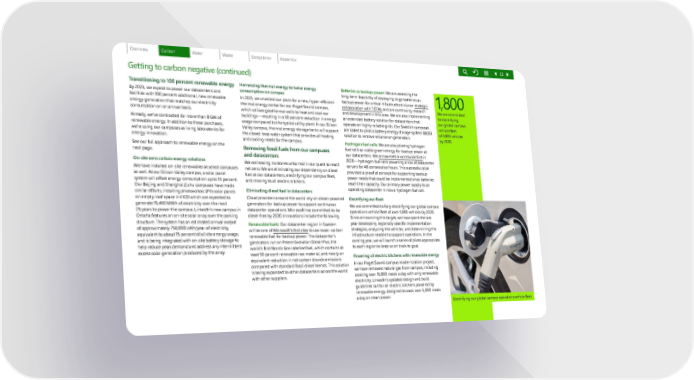 Transitioning to 100 percent renewable energy By 2025, we expect to power our datacenters and facilities with 100 percent additional, new renewable energy generation that matches our electricity consumption on an annual basis. Already, we’ve contracted for more than 8 GW of renewable energy. In addition to these purchases, we’re using our campuses as living laboratories for energy innovation. See our full approach to renewable energy on the next page. On-site zero carbon energy solutions We have installed on-site renewables at select campuses as well. At our Silicon Valley campus, a solar panel system will offset energy consumption up to 15 percent. Our Beijing and Shanghai Zizhu campuses have made similar efforts, installing photovoltaic (PV) solar panels on empty roof space in FY20 which are expected to generate 15,450 MWh of electricity over the next 25 years to power the campus. LinkedIn’s new campus in Omaha features an on-site solar array over the parking structure. The system has an estimated annual output of approximately 750,000 kWh/year of electricity, equivalent to about 15 percent of all site energy usage, and is being integrated with on-site battery storage to help reduce peak demand and address any intermittent excess solar generation produced by the array. Harnessing thermal energy to halve energy consumption on campus In 2021, we unveiled our plans for a new, hyper-efficient thermal energy center for our Puget Sound campus, which utilizes geothermal wells to heat and cool our buildings—resulting in a 50 percent reduction in energy usage compared to the typical utility plant. In our Silicon Valley campus, thermal energy storage tanks will support the closed loop water system that provides all heating and cooling needs for the campus. Removing fossil fuels from our campuses and datacenters We are leaving no stones unturned in our quest to reach net zero. We are eliminating our dependency on diesel fuel at our datacenters, electrifying our campus fleet, and moving to all electric kitchens. Eliminating diesel fuel in datacenters Cloud providers around the world rely on diesel-powered generators for backup power to support continuous datacenter operations. Microsoft has committed to be diesel-free by 2030. Innovations include the following. Renewable fuels: Our datacenter region in Sweden will be one of Microsoft’s first sites to use lower-carbon renewable fuel for backup power. The datacenter’s generators run on Preem Evolution Diesel Plus, the world’s first Nordic Eco-labelled fuel, which contains at least 50 percent renewable raw material, and nearly an equivalent reduction in net carbon dioxide emissions compared with standard fossil diesel blends. This solution is being expanded to other datacenters across the world with other suppliers. Getting to carbon negative (continued) Batteries as backup power: We are assessing the long-term feasibility of deploying large batteries as backup power for critical infrastructure via our strategic collaborat ion with TOTAL and are continuing research and development in this area. We are also implementing an extended battery solution for datacenters that operate on highly reliable grids. Our Swedish campuses are slated to pilot a battery energy storage system (BESS) solution to remove reliance on generators. Hydrogen fuel cells: We are also piloting hydrogen fuel cells as viable green energy for backup power at our datacenters. We announced a worldwide first in 2020—hydrogen fuel cells powering a row of datacenter servers for 48 consecutive hours. This successful pilot provided a proof of concept for supporting backup power needs that could be implemented once batteries reach their capacity. Our primary power supply to an operating datacenter is now a hydrogen fuel cell. Electrifying our fleet We are committed to fully electrifying our global campus operations vehicle fleet of over 1,800 vehicles by 2030. Since announcing this target, we have spent the last year developing regionally specific implementation strategies, analyzing the vehicles, and determining the infrastructure needed to support operations. In the coming year, we will launch a series of pilots appropriate to each region to keep us on track to goal. Powering all electric kitchens with renewable energy In our Puget Sound campus modernization project, we have removed natural gas from campus, including cooking over 15,000 meals a day with only renewable electricity. LinkedIn’s updated design and build guidelines call for all-electric kitchens powered by renewable energy, designed to cook over 5,000 meals a day on clean power. 1,800 We are committed to electrifying our global campus vehicle fleet of 1,800 vehicles by 2030. Electrifying our global campus operations vehicle fleet. 22