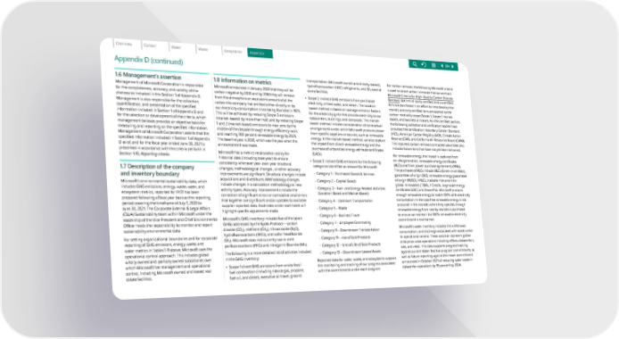 1.6 Management’s assertion Management of Microsoft Corporation is responsible for the completeness, accuracy, and validity of the disclosures included in this Section 1 of Appendix D. Management is also responsible for the collection, quantification, and presentation of the specified information included in Section 1 of Appendix D and for the selection or development of the criteria, which management believes provides an objective basis for measuring and reporting on the specified information. Management of Microsoft Corporation asserts that the specified information included in Section 1 of Appendix D as of, and for the fiscal year ended June 30, 2021 is presented in accordance with the criteria set forth in Section 1.10, Reporting criteria . 1.7 Description of the company and inventory boundary Microsoft’s environmental sustainability data, which includes GHG emissions, energy, waste, water, and ecosystem metrics, reported for FY21 has been prepared following a fiscal year basis as the reporting period covering the timeframe of July 1, 2020 to June 30, 2021. The Corporate External & Legal Affairs (CELA) Sustainability team within Microsoft under the leadership of the Vice President and Chief Environmental Officer holds the responsibility to monitor and report sustainability environmental data. For setting organizational boundaries and for corporate reporting of GHG emissions, energy, waste, and water metrics in Tables 1-9 above, Microsoft uses the operational control approach. This includes global wholly owned and partially owned subsidiaries over which Microsoft has management and operational control, including Microsoft owned and leased real estate facilities. Appendix D (continued) 1.8 Information on metrics Microsoft announced in January 2020 that they will be carbon negative by 2030 and by 2050 they will remove from the atmosphere an equivalent amount of all the carbon the company has emitted either directly or by our electricity consumption since being founded in 1975. This will be achieved by reducing Scope 3 emissions (market-based) by more than half; and by reducing Scope 1 and 2 (market-based) emissions to near zero by the middle of the decade through energy efficiency work and reaching 100 percent renewable energy by 2025. The baseline year is 2020, which was the year when the announcement was made. Microsoft has a metrics recalculation policy for historical data (including base year) to ensure consistency whenever year-over-year structural changes, methodological changes , or other accuracy improvements are significant. Structural changes include acquisitions and divestitures. Methodology changes include changes in a calculation methodology or new activity types. Accuracy improvements include the correction of significant errors or cumulative small errors that together are significant and/or updates to available supplier reported data. Footnotes under each table will highlight specific adjustments made. Microsoft’s GHG inventory includes five of the seven GHGs add ressed by the Kyoto Protocol—carbon dioxide (CO 2 ) , methane (CH 4 ) , nitrous oxide (N 2 O) , hydrofluorocarbons (HFCs), and sulfur hexafluoride (SF 6 ) . Microsoft does not currently use or emit perfluorocarbons (PFCs) and nitrogen trifluoride (NF 3 ) . The following is a more detailed list of activities included in the GHG in ventory: • Scope 1 direct GHG emissions from onsite fossil fuel combustion (including natural gas, propane, fuel oil, and diesel), executive air travel, ground transportation (Microsoft owned and directly leased), h ydrofluorocarbon (HFC) refrigerants, and S F 6 used at some facilities. • Sc ope 2 indirect GHG emissions from purchased electricity, chilled water, and steam. The location- based method is based on average emission factors for the electricity grids that provide electricity to our datacenters, buildings, and campuses. The market- based method includes consideration of contractual arrangements under which Microsoft procures power from specific suppliers or sources, such as renewable energy. In the market-based method, we also capture the impact from direct renewable energy and the purchase of unbundled energy attribute certificates (EACs). • Scope 3 indirect GHG emissions for the following categories identified as relevant for Microsoft: – Category 1 – Pu rchased Goods & Services – Category 2 – Ca pital Goods – Category 3 – Fu el- and Energy-Related Activities (Location-Based and Market-Based) – Category 4 – U pstream Transportation – Category 5 – Wa ste – Category 6 – Bu siness Travel – Category 7 – Em ployee Commuting – Category 9 – D ownstream Transportation – Category 11 – U se of Sold Products – Category 12 – E nd of Life of Sold Products – Category 13 – D ownstream Leased Assets Reported data for water, waste, and ecosystems support the monitoring and tracking of our progress associated with the commitments under each program. For carbon removal, the following Microsoft criteria is used to select carbon removals that we contract: Microsoft Criteria for High-Quality Carbon Dioxide Removal . Both third-party certified and uncertified t ons are purchased in an effort to help develop the market, and only certified tons are applied to the carbon neutrality scope (Scope 1, Scope 2 market- based, and business air travel). For the certified portion, the following validation and verification bodies have provided the certification: Voluntary Carbon Standard (VCS), American Carbon Registry (ACR), Climate Action Reserve (CAR), and California Air Resources Board (CARB). The reported carbon removal contracted value total also includes future tons that have not yet been delivered. For renewable energy, the impact is captured from on-site generation, renewable energy certificates (RECs) and from power purchase agreements (PPAs). The purchases of RECs include: RECs (Green-e certified), guarantees of origin (GO), renewable energy gu