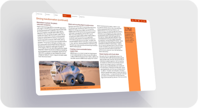 Driving transformation (continued) Blockchain to power the plastic reduction ecosystem Plastic Credit Exchange (PCX), a nonprofit organization with origins in th e Philippines, partnered with Microsoft to develop a blockchain-protected credit registry for the first globa l nonprofit plastic offset program, effectively reducing the flow of plastic waste into our landfills and oceans. PCX has built a wide ecosystem of partners to fac ilitate the recovery, transport, and processing of post-consumer plastic waste, seeking out the most environmentally recommended solutions available. The co mpany undergoes verification via a third-party aud it using its Plastic Pollution Reduction Standard and results are made public through an online registry. PCX now uses a Microsoft Azure-based blockchain solut ion to provide confidence, traceability, and transparen cy within its ecosystem. By the end of 2021, PCX is projected to have enabled the removal of approximately 37 million kilograms of plastic waste from the environment. 10 Waste and recycling digital transformation Australian businesses export around 6,700 consignments of waste each year . As of January 2021, the Australian Department of Ag riculture, Water, and the Environment (DAWE) requires that any business that wants to export waste glass must apply for a license. Working with Atturra and Microsoft, DAWE created a digital platform using Dynamics 365 to streamline the application process for both exporters and department personnel while keeping data secure and private. The system also provides detailed national-level data on exports of waste in near-real time, improving Australia’s understanding of the evolving circular economy and providing an evidence base for future policies. Creating a more sustainable fashion supply chain H&M Group is on a mission to lead the charge towards a more sustainable fashion future. As part of its efforts, in March 2020 the Group launched Treadler, a B2B service that offers access to H&M Group’s supply chain to other fashion brands across the industry. Treadler’s clients will have the necessary data to make more sustainable product development, sourcing, production, and logistics decisions. From selecting materials to choosing suppliers and factories, these sustainable choices can be traced across the H&M Group’s global supply chain and put towards global sustainability goals for the entire fashion industry. Microsoft supported Treadler in the development of its technology infrastructure and backbone. To ensure deployment was fast, Treadler was supported by the Microsoft team to help guide a successful and e fficient implementation. Treadler is also rolling out a da shboard that will help clients better consider manufacturing impacts as they place orders, and provide information about the sustainability performance to make even more informed decisions about sustainability. BeachBot uses AI to spot cigarette butts, pluck them out, and dispose of them in a safe bin. Cleaner beaches with AI and robots Every year, 4.5 trillion cigarette butts end up in the environment. When water touches discarded cigarette butts, the filters l each more than 30 chemicals that are highly toxic to aq uatic organisms. TechTics is working on a solution to resolve this environmental and social issue with technology. It has built a mobile beach- cleaning machine called BeachBot, which uses AI with the help of Azure infrastructure and Microsoft Trove to spot cigarette butts, pick them up, and dispose of them in a safe bin. The beach rover’s AI system is trained to recognize cigarette butts, based on photos submitted via Trove by the public. This responsible approach to AI helps contributors to the project feel like they are part of a larger community tackling cleanup in their environments. 37M By the end of 2021, PCX is projected to have enabled the removal of approximately 37 million kilograms of plastic waste from the environment. 70