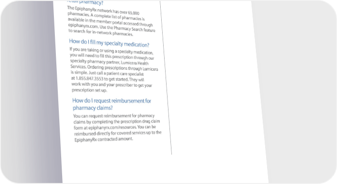 Costco Pharmacy Customer Service is available Monday through Friday, 7:00 a.m. to 9:00 p.m. (CST) and Saturday, 11:30 a.m. to 4:00 p.m. (CST). You can 昀椀nd a list of maintenance medications at epiphanyrx.com. Can I keep using my current retail pharmacy? The EpiphanyRx network has over 65,000 pharmacies. A complete list of pharmacies is available in the member portal accessed through epiphanyrx.com. Use the Pharmacy Search feature to search for in-network pharmacies. How do I fill my specialty medication? If you are taking or using a specialty medication, you will need to fill this prescription through our specialty pharmacy partner, Lumicera Health Services. Ordering prescriptions through Lumicera is simple. Just call a patient care specialist at 1.855.847.3553 to get started. They will work with you and your prescriber to get your prescription set up. How do I request reimbursement for pharmacy claims? You can request reimbursement for pharmacy claims by completing the prescription drug claim form at epiphanyrx.com/resources. You can be reimbursed directly for covered services up to the EpiphanyRx contracted amount. 1.844.820.3260 epiphanyrx.com © 2023 EpiphanyRX All rights reserved. 3860-1021CL