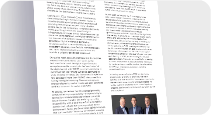 1 2021 was a year marked by both significant challenges and boundless opportunity . We entered the year filled with optimism, anticipating a return to normalcy as COVID-19 case counts moved steadily downward, only to face the stark reality of the Delta and Omicron variants, rising inflation and global supply chain disruptions . But despite these challenges, the Equinix team rose to the occasion . Looking into 2022, renewed COVID-19 optimism is clouded by the tragic events in Ukraine . Equinix is proud to be joining a vigorous global response and providing humanitarian support to the Ukrainian people . But in this increasingly complex and dynamic world, one thing is clear: the need for digital infrastructure continues to rise . Industries across the globe are being reshaped, and digital transformation has become a foundational source of competitive advantage . Digital leaders are demanding infrastructure that is more distributed, more ecosystem powered, more flexible, more sustainable and more interconnected than ever before, and Equinix is uniquely positioned to respond . Our global reach spans 66 metros across 27 countries, and customers continue to see Equinix as the best manifestation of the digital edge . Our scaled ecosystems enable proximity to the “who’s who” of the digital world, with 10,000 customers consisting of more than half the Fortune 500 and a commanding share of cloud on-ramps . Our interconnection platform now consists of more than 419,000 interconnections fueling the digital economy . These advantages are strongly aligned to market trends and allow Equinix to continue to extend its market leadership . At Equinix, we believe that this market leadership comes with deep responsibility—a responsibility to serve all our stakeholders and to leave our world better than we found it . We are living up to this responsibility with a bold future-first sustainability agenda that reflects our company values across Environment, Social and Governance (ESG) initiatives . This starts with our “in service to” mindset, showing up each day in service to each other which, in turn, enables us to be in service to our customers, to our shareholders and to the communities in which we operate . Every day we take action to further our commitment to building a culture where every person can confidently say “I’m Safe, I Belong, and I Matter,” creating an environment that attracts, includes and inspires the diverse and talented teams that bring our vision to life . We were thrilled to receive a perfect score from the Human Rights Campaign Foundation and be recognized as a “Best Place to Work for LGBTQ+ Equality .” We were also proud to be ranked A MESSAGE FROM OUR EXECUTIVE LEADERSHIP #1 in Real Estate in JUST Capital’s 2022 ranking of America’s most “just” companies . And, in a world that needs it more than ever, we have stepped up for our communities, donating over $2 million and volunteering more than 16,500 hours in support of 2,200+ charities around the world . In June 2021, we became the first company in the data center industry to commit to being climate neutral globally by 2030 . This commitment, backed by science-based targets for emissions reductions, an aggressive green financing plan and a comprehensive sustainability agenda, is a critical step in advancing our investments and innovations to reduce greenhouse gas emissions, and reflects the significant role we play in greening our customers’ digital supply chains and addressing the evolving needs of our stakeholders . We are well on our way to meeting our commitments, with over 95% renewable coverage for our portfolio in FY21, reaching over 90% for the fourth consecutive year . We also continue to improve the energy efficiency of our facilities, reducing our Power Usage Efficiency ratio over 5% year-over-year . And starting in 2022, we are holding our broader leadership team financially accountable for achieving both our environmental and our diversity objectives by implementing a modifier to short-term incentives for VP-level employees and above, including executive officers . In closing, as we reflect on 2021, we, like many, are struck by a variety of emotions . We are as optimistic as ever about the tremendous opportunity we see ahead as we seek to fulfill our purpose—to be the platform where the world comes together, enabling the innovations that enrich our work, our life and our planet . Charles Meyers President and Chief Executive Officer Equinix, Inc . Peter Van Camp Executive Chairman Equinix, Inc . Keith Taylor Chief Financial Officer Equinix, Inc .