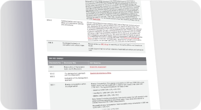 GRI 205: ANTI-CORRUPTION, continued Disclosure No. Disclosure Title 2021 Response 205-1 Operations assessed for risks related to corruption Every organization is judged by the actions of its people . When individuals consistently act with honesty and integrity, their company builds trust and a reputation for ethical behavior . At Equinix, we believe that acting ethically is not only the right thing to do, but it also makes good business sense . Equinix is committed to the highest standards of business and professional conduct . We designed our Code of Business Conduct to reflect and document our ethical values and standards including our stance on corruption . We assign mandatory trainings on the Code of Business Conduct and anti-bribery and corruption to ensure that all Equinix employees are provided guidance on applying our ethical standards in their day-to-day decision-making and actions on behalf of our company . We also periodically survey our employees and conduct risk assessments to assess the effectiveness of our programs . Equinix continually reviews its business operations and market environment to assess the various risks that have the potential to adversely affect our business . These risks, including those related to corruption, are reported annually in the risk factors section of our SEC reporting . Please refer to our 2021 Form 10-K . 205-2 Communication and training about anti-corruption policies and procedures All new hires at Equinix must complete both Code of Business Conduct and anti- bribery and corruption training courses within six months of being hired . After that, employees are expected to take online or in-person compliance training on an annual basis depending on the training schedule each year . Trainings are available in multiple languages through a software program that enables us to reach 100% of Equinix employees . New Board members receive training on anti-bribery and corruption (ABC) risk and Equinix’s ABC policy and training program as part of their onboarding orientation session . Equinix’s management team also participates in all employee mandatory trainings described above . Equinix’s Whistleblower Policy protects corporate “whistleblowers,” ensuring that concerns around ethics and corruption can be taken seriously and acted upon by the Company . 205-3 Confirmed incidents of corruption and actions taken Please review our SEC filings for reporting on Corruption, Ethics and Compliance issues . In 2021, Equinix had no verified violations of applicable anti-bribery and corruption laws . GRI 302: ENERGY Disclosure No. Disclosure Title 2021 Response 103-1 Explanation of the material topic and its Boundary Materiality Assessment 103-2 103-3 The management approach and its components Evaluation of the management approach Equinix’s Environment efforts 302-1 Energy consumption within the organization Energy Consumption: Total energy consumption in 2021 was 7,306 GWh across Scope 1 and 2 (up from 6,589 GWh in 2020 or 10%) . Scope 2 was 7,200 GWh (+11% YOY) . The regional breakdown for Scope 2 was: § Americas: 3,030 GWh (42%, +14% YOY) § Asia-Pacific: 1,490 GWh (21%, +8% YOY) § EMEA: 2,680 GWh (37%, +10% YOY) Note: Scope 2 includes consumption from electric power, fuel cells operated under power purchase agreements and chilled water . These values were assured to Limited Assurance ISO 14064-3 Requirements . Renewable Energy Consumption: Total renewable energy consumption in 2021 was 6,770 GWh (+16% YOY) § Americas: 2,980 GWh (+22% YOY) § Asia-Pacific: 1,120 GWh (+10% YOY) § EMEA: 2,670 GWh (+12% YOY) 16