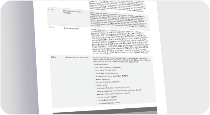 GRI 102: ORGANIZATIONAL PROFILE, continued Disclosure No. Disclosure Title 2021 Response 102-10 Significant changes to the organization and its supply chain In 2021, we opened nine new IBX data centers, opened six new xScale data centers via our joint ventures, and entered three new markets resulting in an increase in our total number of data center facilities to 240, which includes the MU4 and GN1 data centers which opened in January 2022 . In September 2021, we announced that we extended Platform Equinix ® into the strategic Indian market, following the completion of the acquisition of the India operations of GPX Global Systems, Inc . In December 2021, we also announced our expansion into Africa through the planned acquisition of MainOne, a leading West African data center and connectivity solutions provider . GPX and MainOne are excluded from the reporting boundary unless noted otherwise . 102-11 Precautionary Principle or approach Equinix does not specifically apply the precautionary principle; however, Equinix complies with all applicable local, regional, federal, and international laws and regulations . We take steps to ensure that we can operate with the highest levels of integrity and reliability, and we aim to develop programs to meet or exceed industry best practices . Globally, we employ a risk-based approach to our policies and practices and seek to implement best practices around the world, including increased transparency around the impact of our operations and the policies we have in place . 102-12 External initiatives As of December 31, 2021, Equinix participated in the following initiatives, in no particular order: Accounting for Sustainability (A4S), CDP, CEO Action for Diversity & Inclusion, Clean Energy Buyers Association (CEBA), Climate Neutral Data Centre Pact, Digital Inclusion Benchmark, EcoVadis, EU Code of Conduct for Data Centres, the European Data Center Association (EUDCA), EU Data Center Operator, Global Real Estate Sustainability Benchmark (GRESB), Green Datacentre Research Programme, Information Technology Industry Council (and the former The Green Grid), ISO 14001 Environmental Management System, ISO 50001 Energy Management System, NAREIT Real Estate Sustainability Council (RESC) and ESG Forum, Paradigm for Parity, RE100, SASB, Singapore BCA-IMDA Green Mark, S&P Global Corporate Sustainability Assessment, TCFD, techUK, U .S . Environmental Protection Agency (EPA) Energy Star Data Center Rating program, U .S . EPA Green Power Partnership, U .S . Green Building Council (USGBC), VigeoEiris . Please note this list is not exhaustive . 102-13 Membership of associations Equinix’s membership in any trade association does not indicate our agreement with all views and positions taken by the association . As of December 31, 2021, we were active members of the following sample list organizations . Trade Organizations § Asia Cloud Computing Association § Data Center Coalition (DCC) § Dutch Data Centre Association § European Data Centre Association (EUDCA) § France Datacenter § German Datacenter Association § Host in Ireland § Information Technology Industry Council (ITI) § National Association of Real Estate Investment Trusts (Nareit) § Northern Virginia Technology Council (NVTC) § TechUK (United Kingdom) § US India Business Council § US Colombia Business Council GRI 102: STRATEGY Disclosure No. Disclosure Title 2021 Response 102-14 Statement from senior decision-maker CEO Letter 102-15 Key impacts, risks, and opportunities 2021 Form 10-K , Item 1A 12