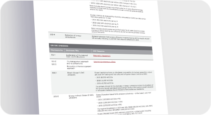 GRI 302: ENERGY, continued Disclosure No. Disclosure Title 2021 Response 302-3 Energy intensity Energy intensity as measured by electricity consumption (GWh) per unit revenue (million USD) was: § 2021: 1 . 084 GWh electricity per million USD (change of +1% YOY § 2020: 1 . 077 GWh electricity per million USD (change of +5% YOY) § 2019: 1 . 028 GWh electricity per million USD (change of +1% YOY) Note: includes electric power and chilled water for all years . Equinix’s energy intensity is driven both by site efficiency as well as how we generate revenue around the world . Energy intensity as measured by electricity consumption (GWh) per data center floor area (gross sq . ft) was: § 2021: 263 GWh electricity per sq . ft § 2020: 258 GWh electricity per sq . ft § 2019: 243 GWh electricity per sq . ft Note: includes electric power and chilled water for all years . Equinix’s energy intensity is driven both by site efficiency as well as how we generate revenue around the world . 302-4 Reduction of energy consumption Demand reduction from energy efficiency investments since 2011 is roughly 47,500 kW annually including 15,500 kW from projects completed in 2021 . GRI 305: EMISSIONS Disclosure No. Disclosure Title 2021 Response 103-1 Explanation of the material topic and its Boundary Materiality Assessment 103-2 103-3 The management approach and its components Evaluation of the management approach Equinix’s Environment efforts 305-1 Direct (Scope 1) GHG emissions Scope 1 emissions from: on-site diesel consumption for backup generation, natural gas used for heating and fuel cells, and refrigerant losses (new since 2018) . § 2021: 50,700 mtCO2e § 2020: 55,100 mtCO2e § 2019: 40,700 mtCO2e The primary drivers for the decrease in Scope 1 emissions include the shutdown of the on-site natural gas-based cogeneration facility at MX1 and an overall reduction in refrigerant leakages due to focused efforts across our operations . 305-2 Energy indirect (Scope 2) GHG emissions Scope 2 Location-based GHG emissions (electricity + chilled water), with YOY trend: § 2021: 2,307,600 mtCO2e (+1%) § 2020: 2,280,200 mtCO2e (+10%) § 2019: 2,079,000 mtCO2e (+9%) The regional breakdown in 2021 was: 38% AMER (881,100 mtCO2e); 34% APAC (786,200 mtCO2e); 28% EMEA (640,300 mtCO2e) . Scope 2 Market-based GHG emissions (electricity + chilled water) including contribution of renewable energy purchasing, with YOY trend: § 2021: 254,800 mtCO2e (-22%) § 2020: 327,700 mtCO2e (+7%) § 2019: 306,000 mtCO2e (+36%) – driven by acquisitions The regional breakdown in 2021 was: 3% AMER (8,200 mtCO2e); 96% APAC (245,100 mtCO2e); 1% EMEA (1,500 mtCO2e) . Market-based methodologies take into account Equinix’s large renewable energy purchases, which allow us to use a 0 mtCO2e/MWh emissions factor (or net zero emissions from electricity) . 17