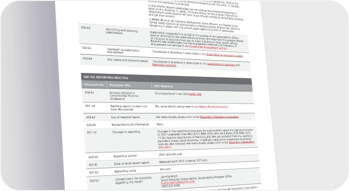 GRI 102: STAKEHOLDER ENGAGEMENT Disclosure No. Disclosure Title 2021 Response 102-40 List of stakeholder groups For more details, please refer to our Stakeholder Engagement Table . 102-41 Collective bargaining agreements In the Americas, both Brazil and Canada have collective bargaining . 100% of the workforce in Brazil is covered by collective bargaining with the union . In Canada, 4 .4% of the workforce is unionized . In Asia-Pacific, Equinix employees are not covered by collective bargaining or labor unions . However, in Japan, China and Korea, for any change in benefit or employment terms, Equinix will have to go through employee consultation process and get their consent . In EMEA, France, UK, Germany, Netherlands, Spain, Finland and Sweden have formal works councils or representative employee bodies . France has collective bargaining in place with the current scope applying to 65% of employees . 102-42 Identifying and selecting stakeholders Stakeholder engagement is critical to the success of our sustainability efforts . Equinix identifies its key stakeholders as those who may have the greatest impact or influence on Equinix’s business or those that Equinix most greatly affects . Equinix’s key stakeholders and the engagement methods and frequency of engagement are detailed in our Stakeholder Engagement section . 102-43 Approach to stakeholder engagement This process is described in more detail in the Stakeholder Engagement section . 102-44 Key topics and concerns raised This process is described in more detail in the Stakeholder Engagement and Materiality sections . GRI 102: REPORTING PRACTICE Disclosure No. Disclosure Title 2021 Response 102-45 Entities included in consolidated financial statements All entities listed in our 2021 Form 10-K 102-46 Defining report content and topic Boundaries For more details, please refer to our Report Profile discussion . 102-47 List of material topics For more details, please refer to our Materiality Assessment discussion . 102-48 Restatements of information None 102-49 Changes in reporting Changes in the operational boundary for sustainability report include: the inclusion of 2021 completed sites (BX1, DC21, FR8, LD11x, MC1, ML5, PA9x, SG5, SP5x, SV11, TY12x) . Equinix acquisitions of MainOne and GPX are excluded from the reporting boundary unless noted otherwise . In addition, data center expansions at existing sites are also included . For more details, please refer to our Materiality Assessment discussion . 102-50 Reporting period 2021 calendar year 102-51 Date of most recent report Released April 2022 covering 2021 data 102-52 Reporting cycle Annually 102-53 Contact point for questions regarding the report Jennifer Ruch Senior Director, Sustainability, Sustainability Program Office Sustainability@equinix . com 1 .800 .322 .9280 102-54 Claims of reporting in accordance with the GRI Standards This report has been prepared in accordance with the GRI Standards: Core option . 102-55 GRI content index Included in this section 102-56 External assurance This report does not have external assurance; however, Equinix’s 2015–2021 energy, renewable energy, and Scope 1, Scope 2 and Scope 3 emissions have been externally verified to Limited Assurance Standards ISO 14064-3 . 14