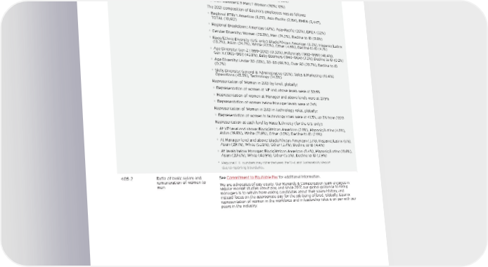 GRI 405: DIVERSITY AND EQUAL OPPORTUNITY, continued Disclosure No. Disclosure Title 2021 Response 405-1 Diversity of governance bodies and employees The 2021 composition of Equinix’s governance bodies and Executive team was as follows: § Board of Directors: 6 Men: 3 Women (67%; 33%) § E-staff members: 9 Men: 1 Woman (90%; 10%) The 2021 composition of Equinix’s employees was as follows: § Regional FTEs*: Americas (5,011), Asia-Pacific (2,154), EMEA (3,447), TOTAL (10,612) § Regional Breakdown: Americas (47%), Asia-Pacific (20%), EMEA (32%) § Gender Diversity: Women (25 .3%), Men (74 .2%), Decline to ID (0 .5%) § Race/Ethnic Diversity (U .S . only): Black/African American (6 .3%), Hispanic/Latinx (13 .2%), Asian (24 . 7%), White (47 .1%), Other (4 .6%), Decline to ID (4 . 1%) § Age Diversity: Gen Z (1999–2012) (0 .30%), Millennials (1982–1999) (48 .4%), Gen X (1965–1981) (43 .8%), Baby Boomers (1946–1964) (7 .3%), Decline to ID (0 .2%) § Age Diversity: Under 30 (13%), 30–50 (66 . 1%), Over 50 (20 .7%), Decline to ID (0 .2%) § Skills Diversity: General & Administrative (26%), Sales & Marketing (16 .4%), Operations (43 .3%), Technology (14 .3%) Representation of Women in 2021 by level, globally: § Representation of women at VP and above levels were at 30 .6% § Representation of women at Manager and above levels were at 27 .9% § Representation of women below Manager levels were at 24% Representation of Women in 2021 in technology roles, globally: § Representation of women in technology roles were at 41 .3%, up 3% from 2020 Representation at each level by Race/Ethnicity (for the U .S . only): § At VP level and above: Black/African American (2 .9%), Hispanic/Latinx (4 .9%), Asian (16 .5%), White (71 .8%), Other (1 . 0%), Decline to ID (2 .9%) § At Manager level and above: Black/African American (3 . 1%), Hispanic/Latinx (6%), Asian (29 .1%), White (53 .8%), Other (3 . 7%), Decline to ID (4 .4%) § At levels below Manager: Black/African American (9 .4%), Hispanic/Latinx (19 .8%), Asian (20 .6%), White (40 .9%), Other (5 .5%), Decline to ID (3 .9%) * Regional FTE numbers may differ between the 10-K and Sustainability Report due to reporting boundaries . 405-2 Ratio of basic salary and remuneration of women to men See Commitment to Equitable Pay for additional information . We are advocates of pay equity . Our Rewards & Compensation team engages in regular market studies about pay, and since 2017, our global guidance to hiring managers is to refrain from asking candidates about their salary history, and instead focus on the appropriate pay for the job being offered . Globally, Equinix representation of women in the workforce and in leadership roles is on par with our peers in the industry . 21