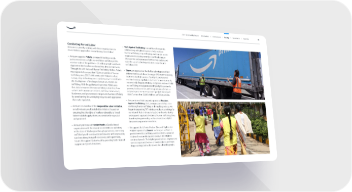 • Tech Against Trafficking is a coalition of companies collaborating with global experts to help eradicate human trafficking using technology. Amazon sits on the organization’s steering committee and has leveraged the expertise and resources of AWS to help explore and scale the use of technology solutions across the anti- trafficking field. • Thorn , an organization that builds technology to defend children from sexual abuse, leverages AWS machine learning tools in its Spotlight product. Spotlight’s sophisticated machine learning capabilities save time for investigators by automatically flagging ads likely to represent victims of child sex trafficking. Investigators search Spotlight’s constantly growing database of ads and set up automated alerts to empower proactive investigations. Spotlight has helped identify more than 20,000 child sex trafficking victims. • Amazon is an official corporate sponsor of Truckers Against Trafficking (TAT), an organization dedicated to combating human trafficking in the trucking industry. We began incorporating TAT training modules into trainings for our internal fleet of drivers to teach them how to identify and respond to potential victims of human trafficking. Since launching this partnership, we have trained over 9,000 Amazon transportation associates. • We support the UK-wide Modern Slavery & Exploitation Helpline operated by Unseen , investing in its efforts to provide immediate and long-term assistance to potential victims of modern slavery and to ensure the helpline’s continued growth. The helpline provides direct response and services to potential victims of modern slavery and helps shape trainings and wider services for vulnerable people. Combating Forced Labor Amazon is currently working with these organizations to devise holistic approaches to combating forced labor: • Amazon supports Polaris , a nonprofit leading a social justice movement to fight sex and labor trafficking at the massive scale of the problem—25 million people worldwide deprived of the freedom to choose how they live and work. Through the U.S. National Human Trafficking Hotline, Polaris has responded to more than 73,000 situations of human trafficking since 2007. AWS works with Polaris to infuse cutting-edge technology into its infrastructure to accelerate the development of the largest known U.S. dataset on trafficking. With the guidance of survivors, Polaris uses that data to improve the way trafficking is identified, how victims and survivors are assisted, and how communities, businesses, and governments can prevent human trafficking by transforming the underlying inequities and oppressions that make it possible. • Amazon is a member of the Responsible Labor Initiative , a multi-industry, multistakeholder initiative focused on ensuring that the rights of workers vulnerable to forced labor in global supply chains are consistently respected and promoted. • Amazon partners with StolenYouth , a Seattle-based organization with the mission to end child sex trafficking in the state of Washington through prevention, connecting trafficked youth to resources and services, and empowering survivors along their path to recovery and a promising future. We support StolenYouth by providing both financial support and goods donations. 2021 Sustainability Report Introduction I Environment I Society I Governance I Appendix 66