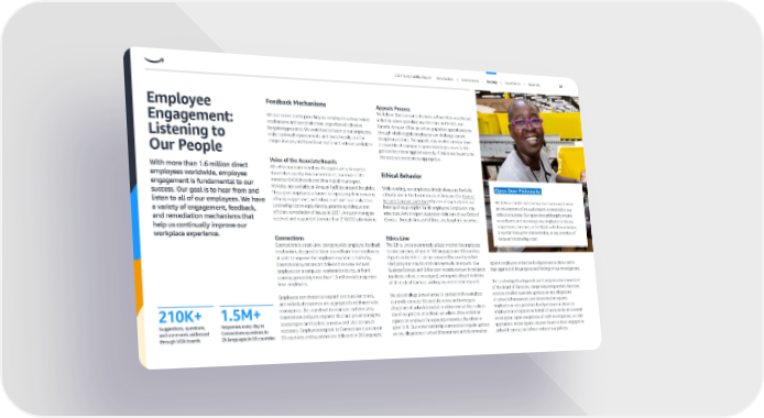 Employee Engagement: Listening to Our People With more than 1.6 million direct employees worldwide, employee engagement is fundamental to our success. Our goal is to hear from and listen to all of our employees. We have a variety of engagement, feedback, and remediation mechanisms that help us continually improve our workplace experience. Open-Door Philosophy We believe candid and constructive communication in an environment of mutual respect is essential to our collective success. Our open-door philosophy means we welcome and encourage any employee to discuss suggestions, concerns, or feedback with their manager, a Human Resources team member, or any member of Amazon’s leadership team. Feedback Mechanisms We are committed to providing our employees with grievance mechanisms and remedial action, regardless of collective bargaining presence. We work hard to listen to our employees, make continual improvements, and invest heavily to offer competitive pay and benefits in a safe and inclusive workplace. Voice of the Associate Boards We offer our team members the opportunity to express themselves openly. For our associates, our Voice of the Associate (VOA) boards and their digital counterpart, MyVoice, are available at Amazon facilities around the globe. These give employees a forum for expressing their concerns, offering suggestions, and asking questions on a daily basis. Leadership teams reply directly, promoting dialogue and efficient remediation of issues. In 2021, Amazon managers received and responded to more than 210,000 submissions. Connections Connections is a real-time, companywide employee feedback mechanism, designed to listen to and learn from employees at scale to improve the employee experience. Each day, Connections questions are delivered to every Amazon employee on a computer, workstation device, or hand scanner, generating more than 1.5 million daily responses from employees. Employees can choose to respond to a question or not, and individual responses are aggregated and shared with managers at the team level to maintain confidentiality. Connections analyzes response data and provides insights to managers and leaders to review and take actions as necessary. Employees respond to Connections questions in 55 countries, and questions are delivered in 26 languages. 210K+ Suggestions, questions, and comments addressed through VOA boards Appeals Process We believe that everyone deserves to have their voice heard, including when appealing any decisions. In the U.S. and Canada, Amazon offers an online, paperless appeals process, through which eligible employees can challenge certain disciplinary actions. The appeals may involve a review from a second-level manager or general manager to verify that policies have been applied correctly. If this is not found to be the case, we remediate as appropriate. Ethical Behavior While working, our employees should always act lawfully, ethically, and in the best interests of Amazon. Our Code of Business Conduct and Ethics (Code of Conduct) sets out basic guiding principles for all employees. Employees may raise questions or report suspected violations of our Code of Conduct through Amazon’s Ethics Line, by phone or online. Ethics Line The Ethics Line is a commonly utilized method for employees to raise concerns, offered in 165 languages and 63 countries. Reports to the Ethics Line are answered by an independent third party and may be made anonymously on request. Our Business Conduct and Ethics team records, reviews, investigates (or directs others to investigate), and reports alleged violations of the Code of Conduct, tracking any remediation required. We take all allegations of unlawful conduct in the workplace extremely seriously. We carefully review and investigate allegations of unlawful conduct or other conduct that violates any of our policies. In addition, we will not allow retaliation against an employee for reporting misconduct by others in good faith. Our senior leadership team receives regular updates on any allegations of unlawful harassment and discrimination 1.5M+ Responses every day to Connections questions in 26 languages in 55 countries against employees in director-level positions or above and is kept apprised of the progress and findings of our investigations. The Leadership Development and Compensation Committee of the Board of Directors, comprising independent directors, receives detailed quarterly updates on any allegations of unlawful harassment and discrimination against employees in vice-president-level positions or above or employees investigated on behalf of Amazon by an external investigator. Upon completion of each investigation, we take appropriate action against anyone found to have engaged in unlawful conduct or to have violated our policies. 2021 Sustainability Report Introduction I Environment I Society I Governance I Appendix 57