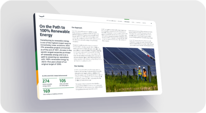 On the Path to 100% Renewable Energy Transitioning to renewable energy is one of the highest-impact ways to immediately lower emissions. With 274 renewable projects announced as of the end of 2021, Amazon is the world’s largest corporate purchaser of renewable energy and is on a path to powering our operations with 100% renewable energy by 2025—five years ahead of our original target of 2030. Our Approach Since 2014, Amazon has invested in global renewable energy generation to decarbonize our business across our worldwide operations. We procure new renewable energy through contracts for utility-scale wind and solar, on-site rooftop solar installations, and green tariffs with local utilities that deliver new, renewable energy to the grids where we operate. Our projects supply renewable energy for a variety of Amazon facilities, including corporate offices, fulfillment centers, data centers, and physical stores, which collectively serve millions of customers globally. These projects also help meet Amazon’s commitment to produce the clean energy equivalent of the electricity used by every customer’s Echo device. We are making additional large-scale investments in wind and solar farm capacity, which will produce the clean energy equivalent to the electricity used by all Echo, Fire TV, and Ring devices worldwide by 2025. Our Journey In 2021, we reached 85% renewable energy across our business, with more than 12 gigawatts (GW) of renewable energy production capacity across our global portfolio. Once these projects are fully operational, they are expected to deliver up to 33,700 gigawatt-hours of energy annually— the electricity output equivalent to powering more than 3 million U.S. homes for one year. These projects helped power more than 30 million megawatt-hours (MWh) of electricity used by Amazon in 2021 and led to a 23% reduction in our carbon emissions from purchased electricity from 2020 to 2021. In 2021, we expanded our renewable energy footprint into new geographies, and by the end of the year, announced renewable energy projects across 18 countries. Our first solar projects in South Africa and the United Arab Emirates came online, and we announced new projects in Singapore, Japan, Australia, and China. Our projects in South Africa and Japan are the first corporate-backed, utility-scale solar farms in these countries. 274 Global renewable energy projects 105 Utility-scale wind and solar projects 169 Solar rooftops on facilities and stores We also announced two new offshore wind projects in Europe, including our largest renewable energy project to date. As of December 2021, we have enabled more than 3.5 GW of renewable energy in Europe through 80 projects, making Amazon the largest purchaser of renewable energy in Europe. In June 2021, Amazon announced our largest renewable energy project in Canada. Once online, Amazon’s renewable projects in Canada will produce more than 1 million MWh each year—enough to power more than 100,000 Canadian homes. As of the end of 2021, Amazon had announced: 2021 Sustainability Report Introduction I Environment I Society I Governance I Appendix 20