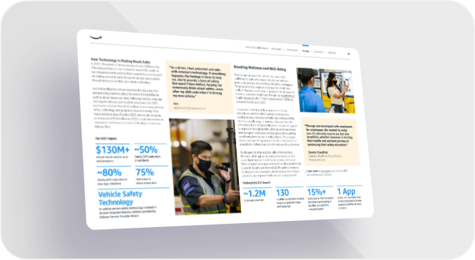 “ The app was developed with employees, for employees. We wanted to make sure it’s not only easy to use but also beneficial, whether someone is starting their health and wellness journey or continuing their safety education.” Chandni Chandihok Workplace Health and Safety Product Manager, Amazon How Technology Is Making Roads Safer In 2021, thousands of drivers navigated over 2 billion miles delivering packages to our customers around the world. As our transportation businesses have expanded, we’ve focused on making our roads safer for our drivers and communities through innovative mobile and vehicle technology. Artificial intelligence reduces accidents by capturing data and providing real-time alerts for unsafe driving behavior, such as driver distraction, close following distance, stop sign and signal violations, and seatbelt infractions. Our 2021 investment of more than $130 million in new transportation safety technology and programs resulted in nearly 50% fewer accidents since October 2020, and we are investing an incremental $100 million in 2022 to scale innovations in ergonomics and driver assistance technologies across our delivery fleet. Boosting Wellness and Well-Being When people are given the tools to take care of their well-being at work and at home, they are not only less prone to injuries but they feel better, healthier, and happier. We proactively help employees manage their health and wellness through a wide range of programs. We also provide access to convenient health care through our Neighborhood Health Centers , with 17 facilities located near fulfillment centers in the U.S. as of 2021. Our innovative WorkingWell program uses academic research and certified athletic trainers to educate new employees about their bodies, health, and wellness to help them successfully adapt to working at Amazon. After the onboarding phase, WorkingWell continues to provide support to employees through Huddles, which are meetings among small groups of employees covering topics such as training, conditioning, bending, and handling objects. These regular connections provide opportunities to discuss the benefits of strong body mechanics and provide ongoing safety education. We also provide short activities called Mind and Body Moments, which appear on workstation screens at sites across North America, South America, India, and Europe. These messages encourage employees to take regular breaks to stretch, breathe, and be mindful. The goal is to improve employees’ mental and physical well-being, reduce fatigue and stress, and improve health and safety engagement. “ As a driver, I feel protected and safer with Amazon’s technology. If something happens, the footage is there to help me. Alerts provide a level of safety that wasn’t there before, helping me consciously think about safety—even after my shift ends when I’m driving my own vehicle.” Nick Operations Manager, Amazon Our 2021 Impact: WorkingWell 2021 Impact: $130M+ Investment in vehicle tech and programs ~1.2M Employees reached 130 Huddles customized to sites based on operation type and language 15%+ Reduction in MSD incidents for those participating in Huddles compared to nonparticipants 1 App In the U.S. to enable even more employees to access sessions whether at work or home Vehicle Safety Technology In-vehicle camera safety technology installed in Amazon-branded delivery vehicles operated by Delivery Service Provider drivers ~50% Nearly 50% reduction in accidents ~80% Nearly 80% reduction in stop sign violations 75% Reduction in driver distraction Learn more in our report on safety, health, and well-being at Amazon. 2021 Sustainability Report Introduction I Environment I Society I Governance I Appendix 60