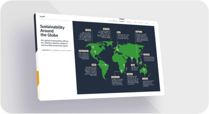 Sustainability Around the Globe Our global sustainability efforts are making a positive impact in communities around the world. Learn more about our global initiatives on our website. Australia Indonesia India Singapore Italy Tanzania Brazil United States Canada South Africa Supported Solcast to use cloud cover, solar radiation, and photovoltaic power data to provide forecasts to the solar power industry. Partnered with Water.org and WaterAid in India and Indonesia to provide clean water to over 250,000 community members. Began adding 10,000 electric vehicles to our existing fleet. Announced our first renewable energy project in Singapore, a 62-megawatt (MW) solar project made up of a series of solar panels mounted on a ground system that will generate 80,000 MWh of clean energy annually. Supported Parco Italia, an urban forestry program that aims to plant 22 million trees across 14 metropolitan areas in Italy. Germany Partnered with The Nature Conservancy’s Urban Greening Program in Germany and supported mapping and analysis for roofs, grasslands, and urban streetscapes in Berlin. Began hosting data on AWS on the Digital Earth Africa platform to monitor how coastal erosion, rising sea levels, and deforestation are contributing to the degradation of mangrove trees on the island. Partnered with The Nature Conservancy to launch the Agroforestry and Restoration Accelerator to restore native rainforest to naturally trap and store carbon and mitigate climate change. Women at Amazon in the U.S. earned 99.9 cents for every dollar that men earned performing the same jobs in 2021. Announced our largest renewable energy project in Canada in June 2021. Once online, our renewable projects in Canada will produce more than 1 million megawatt-hours (MWh) each year. Launched our first operational solar project in South Africa, expected to generate up to 28,000 MWh of renewable energy per year for the grid. 2021 Sustainability Report Introduction I Environment I Society I Governance I Appendix 5