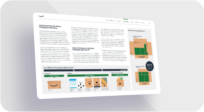 Size with new algorithm 1,393 inch 3 34.7% External cube reduction Size with old algorithm 2,133 inch 3 No Amazon Packaging Paperboard Envelopes Unpadded Bags Recyclable Paper Padded Mailer locker locker locker Padded Mailer locker locker locker Flexible Mailers locker Boxes Shipment Zero Packaging Flexibles Corrugated 8% of shipments 49% of shipments 43% of shipments Lower Waste Optimizing Materials Where Packaging Is Necessary When additional Amazon packaging is required to ship a product, we strive to optimize that packaging for increased recyclability along with reduced waste and carbon. We are transitioning to materials that are compatible with local paper and plastic recycling streams where we operate. We also support initiatives to expand the availability of curbside recycling infrastructure to the public through investments in The Recycling Partnership and the Closed Loop Infrastructure Fund. In the U.S., we expanded the use of our recyclable paper padded mailer, replacing nearly 70% of our mixed material bubble mailers in 2021. We also improved the composition of our single-use plastic packaging to use less material and incorporate more recycled content. In 2021, we increased the recycled content of our plastic film bags from 25% to 50% and that of our plastic padded bags from 15% to over 40%. Through these collective efforts, we avoided over 30,000 tons of plastic across North America in 2021. Algorithm Packaging Efficiencies Our Fulfillment Packaging Breakdown in 2021 when smaller products are suitable for flexible packaging, such as padded mailers and bags, which are up to 75% lighter than similar-sized boxes. Over the past five years, these algorithms have allowed us to reduce the use of corrugated boxes by over 35%. In 2021, we deployed data-science algorithms to optimize the number and size of boxes used for 12 geographies around the world. These algorithms—which help our fulfillment centers maintain the right mix of box sizes— now cover 65% of global box shipments, with plans to scale to 97% in 2022. We also introduced advanced fitting algorithms designed to reduce packaging specifically for shipments with multiple items. These new algorithms calculate the possible arrangements of products for best fit in a three- dimensional virtual package. Since launch, this technology has downgraded the size or type of packaging for 7% of total shipments and we plan to deploy it globally in 2022. In Europe, we switched from single-use plastic delivery bags to recyclable paper delivery bags and cardboard envelopes for orders shipped from fulfillment centers in 2021. We also removed a wide range of single-use plastic products from our European stores. In Australia, we replaced all single-use air pillows with 100% recyclable paper material to protect goods during shipping. Amazon also became a founding member of the India Plastics Pact after removing single-use, thin film plastics from Amazon packaging throughout India fulfillment centers in 2020. Using Technology to Optimize Packaging Type and Fit We use a range of boxes and mailers across our fulfillment network, and for every shipment that requires packaging, we use science-based systems to determine optimal packaging sizes and types. This starts with using machine learning to identify products that can be delivered safely with less material. Machine learning algorithms help us determine 2021 Sustainability Report Introduction I Environment I Society I Governance I Appendix 29