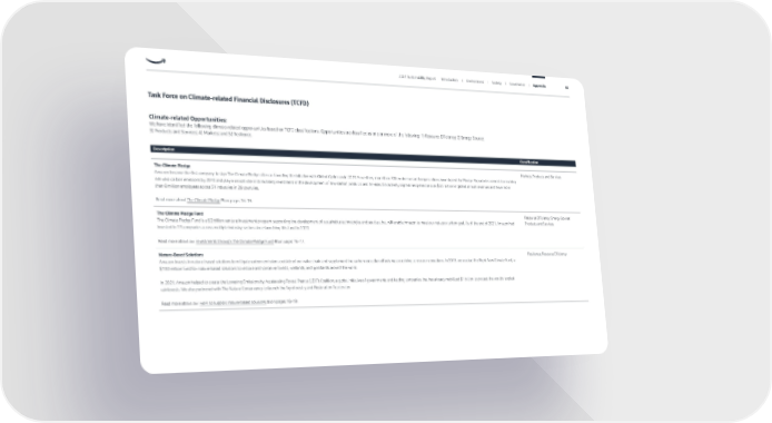 Climate-related Opportunities: We have identified the following climate-related opportunities based on TCFD classifications. Opportunities are classified as one or more of the following: 1) Resource Efficiency; 2) Energy Source; 3) Products and Services; 4) Markets; and 5) Resilience. Description Classification The Climate Pledge Amazon became the first company to sign The Climate Pledge after co-founding the initiative with Global Optimism in 2019. Since then, more than 300 businesses and organizations have signed the Pledge. Signatories commit to reaching net-zero carbon emissions by 2040 and play a critical role in stimulating investment in the development of low-carbon products and services. Collectively, signatories generate over $3.5 trillion in global annual revenues and have more than 8 million employees across 51 industries in 29 countries. Read more about The Climate Pledge on pages 14–15. Markets; Products and Services The Climate Pledge Fund The Climate Pledge Fund is a $2 billion venture investment program supporting the development of sustainable technologies and services that will enable Amazon to meet our net-zero carbon goal. As of the end of 2021, Amazon had invested in 13 companies across multiple industry sectors since launching this fund in 2020. Read more about our investments through The Climate Pledge Fund on pages 16–17. Resource Efficiency; Energy Source; Products and Services Nature-Based Solutions Amazon invests in nature-based solutions to mitigate carbon emissions outside of our value chain and supplement the carbon-reduction efforts we are driving across our operations. In 2019, we created the Right Now Climate Fund, a $100 million fund for nature-based solutions to restore and conserve forests, wetlands, and grasslands around the world. In 2021, Amazon helped to create the Lowering Emissions by Accelerating Forest finance (LEAF) Coalition, a global initiative of governments and leading companies that has already mobilized $1 billion to protect the world’s tropical rainforests. We also partnered with The Nature Conservancy to launch the Agroforestry and Restoration Accelerator. Read more about our work to support nature-based solutions on pages 18–19. Resilience; Resource Efficiency Task Force on Climate-related Financial Disclosures (TCFD) 2021 Sustainability Report Introduction I Environment I Society I Governance I Appendix 92