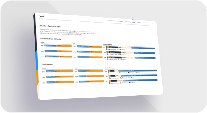 Global Inclusion: By the Numbers Real progress requires actions that can be tracked. We measure and share DEI data to better understand where we are in our journey and where we need to go. See the Appendix for the full set of diversity and inclusion data, including for Field and Customer Support, Corporate Employees, and Senior Leaders. U.S. Amazon Workforce (All Levels) U.S. Race/Ethnicity Global People Managers U.S. U.S. Race/Ethnicity 2019 2020 2021 27.8% Women 72.2% Men 29.3% Wo men 70.7% Men 30.8% Wo men 69.2% Men 2019 2020 2021 28.0% Wo men 72.0% Men 29.0% Wo men 71.0% Men 30.5% Wo men 69.5% Men 2019 2020 2021 21.1% Asian 58.9% Wh ite 3.0% Multiracial 0.6% Native American 19.5% Asian 10.6% Black 56.4% Wh ite 3.2% Multiracial 0.7% Native American 19.9% Asian 12.0% Black 53.1% Wh ite 3.3% Multiracial 8.1% Latinx 9.5% Latinx 10.9% Latinx 8.3% Black 0.7% Native American 2021 2019 2020 2021 42.7% Wo men 57.3% Men 44.6% Wo men 55.4% Men 44.8% Wo men 55.2% Men 2019 2020 2021 45.4% Wo men 54.6% Men 46.9% Wo men 53.1% Men 47.0% Wo men 53.0% Men 2019 2020 2021 18.6% Latinx 15.4% Asian 34.6% Wh ite 26.4% Black 3.6% Multiracial 1.3% Native American 22.8% Latinx 13.6% Asian 32.1% Wh ite 26.5% Black 3.6% Multiracial 1.5% Native American 23.6% Latinx 13.2% Asian 30.2% Wh ite 28.2% Black 3.3% Multiracial 1.5% Native American 2021 2021 Sustainability Report Introduction I Environment I Society I Governance I Appendix 56